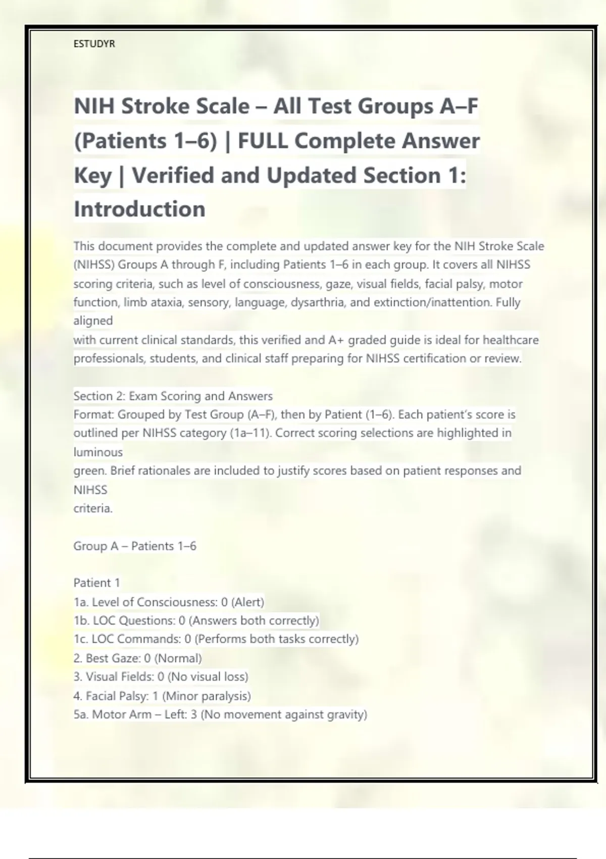 This document provides the complete and updated answer key for the NIH Stroke Scale