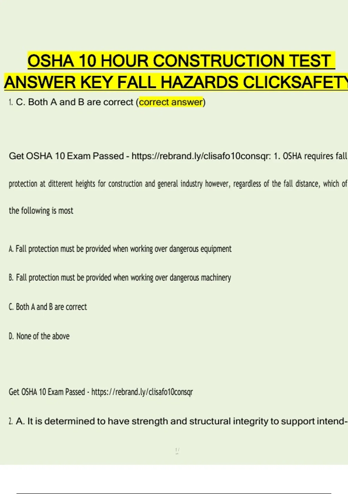 Prepare confidently for the OSHA 10-Hour Construction Fall Hazards test on ClickSafety with this accurate and up-to-date 2025 answer key and study guide. This resource is designed to help construction workers, students, and trainees understand fall hazard concepts clearly and pass the assessment with confidence. This study resource includes: Verified correct answers for OSHA 10-Hour Construction Fall Hazards (ClickSafety) Coverage of key OSHA fall protection standards and requirements Review of common fall hazards, including ladders, scaffolds, roofs, and unprotected edges Clear explanations of fall prevention methods, personal protective equipment (PPE), and employer responsibilities Ideal for exam review, knowledge reinforcement, and safety training preparation Perfect for those completing OSHA certification coursework, this guide helps you reinforce critical safety knowledge, reduce mistakes, and successfully complete the ClickSafety Fall Hazards assessment.