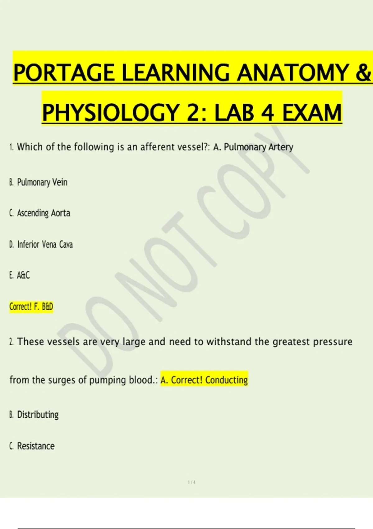 Portage Learning Anatomy & Physiology 2 Lab 4 Exam 2025 – Complete Study Guide with Practice Questions & Verified Answers