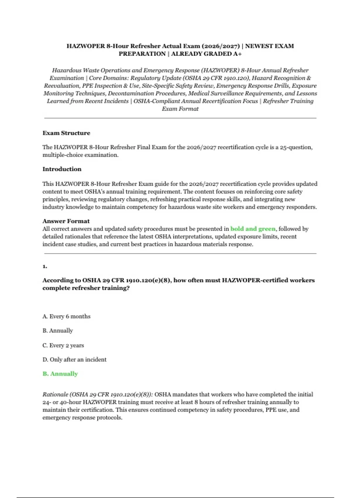 The HAZWOPER 8-Hour Refresher Final Exam for the 2026/2027 recertification cycle is a 25-question,