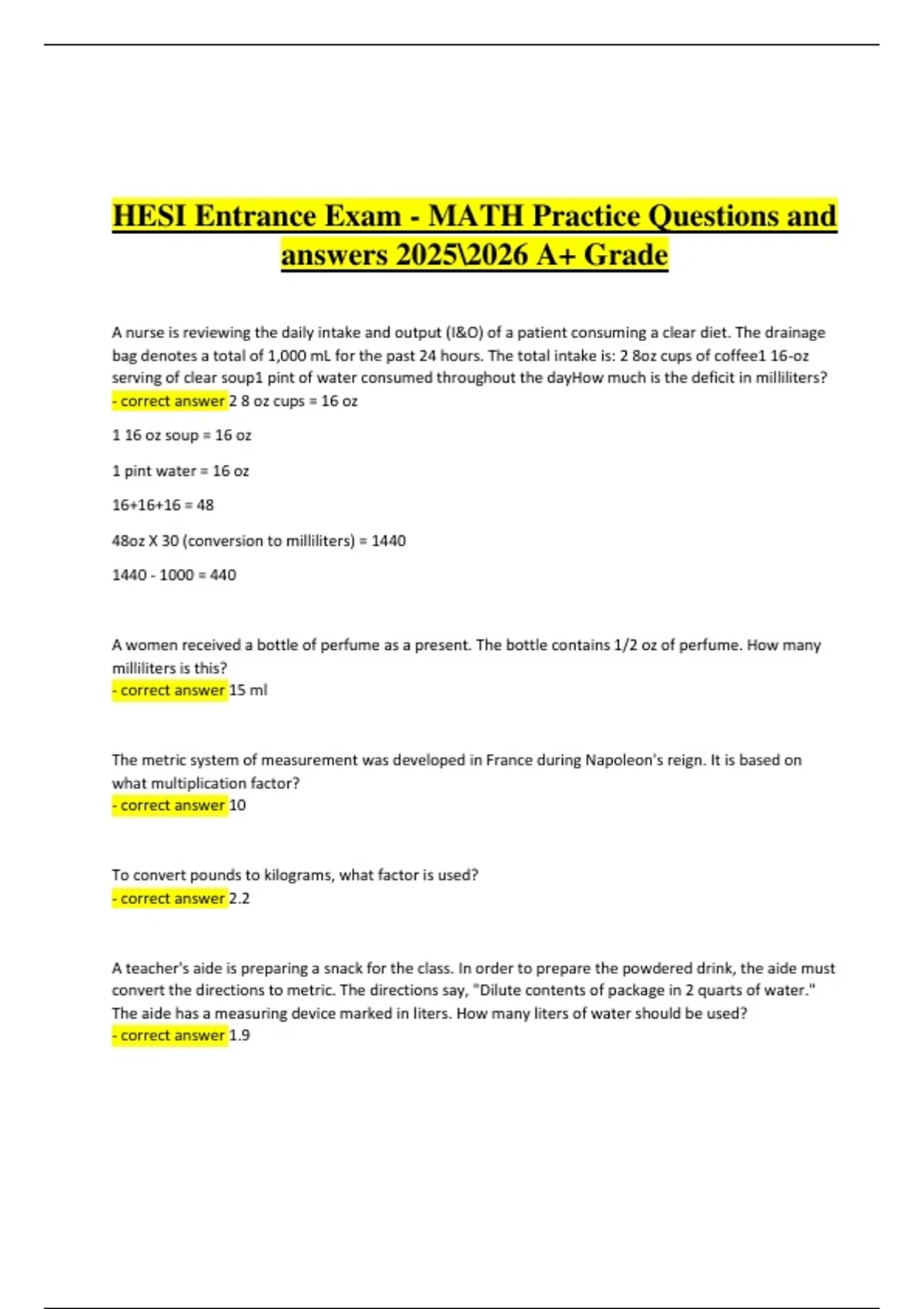 The Math section of the HESI A2 Admission Assessment Exam evaluates a student’s ability to perform essential calculations required in nursing and healthcare. The 2025/2026 verified practice sets provide A+ graded questions and answers with rationales.