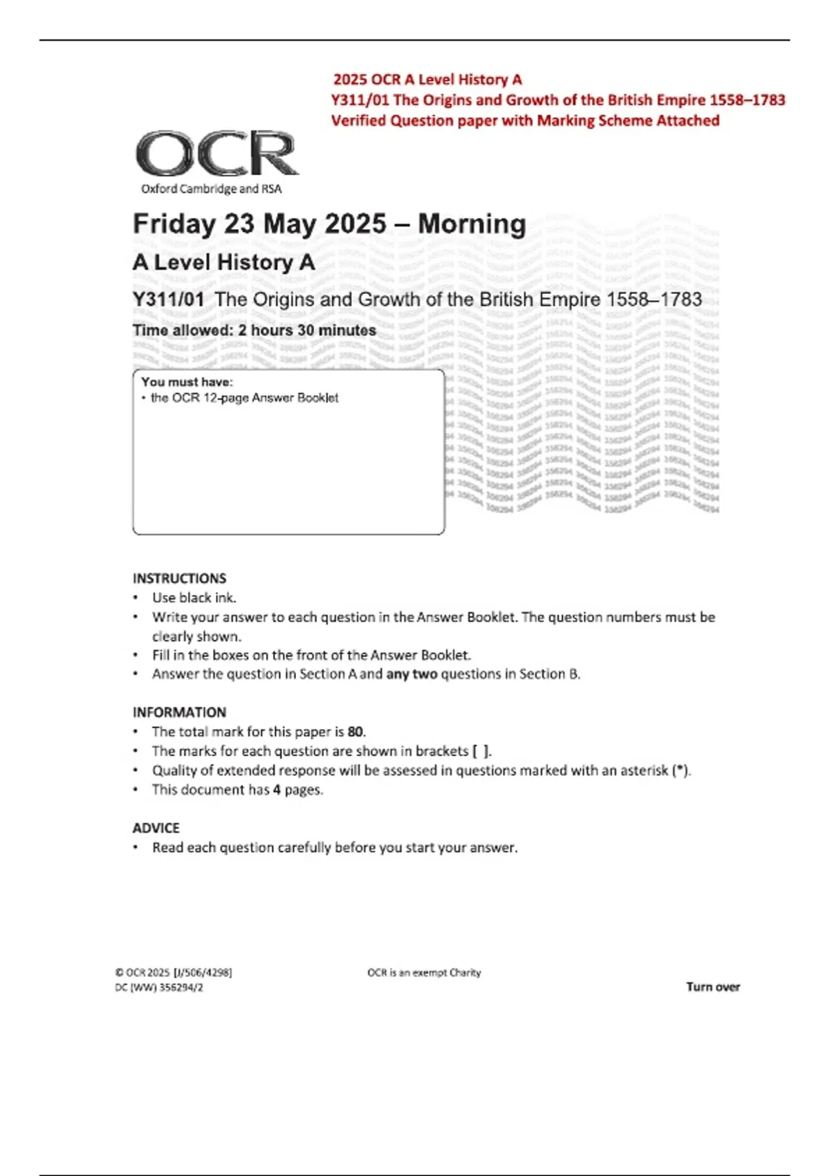 OCR A Level 2025 History A Y311/01 The Origins and Growth of the British Empire 1558–1783 Question Paper | Official with Marking Scheme & Fully Worked Answers