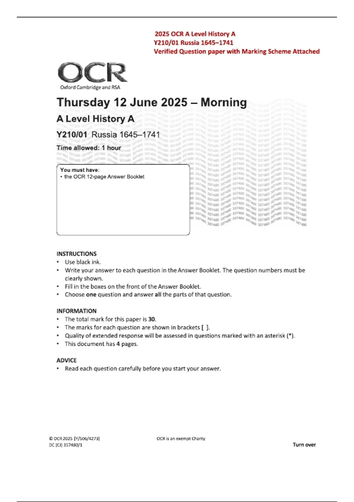 Prepare for OCR A Level 2025 History A with this official Y210/01 question paper on Russia 1645–1741. Includes detailed marking scheme, fully worked answers, comprehensive topic coverage, and strategies for achieving top marks. Ideal for exam preparation, structured revision, and academic excellence.