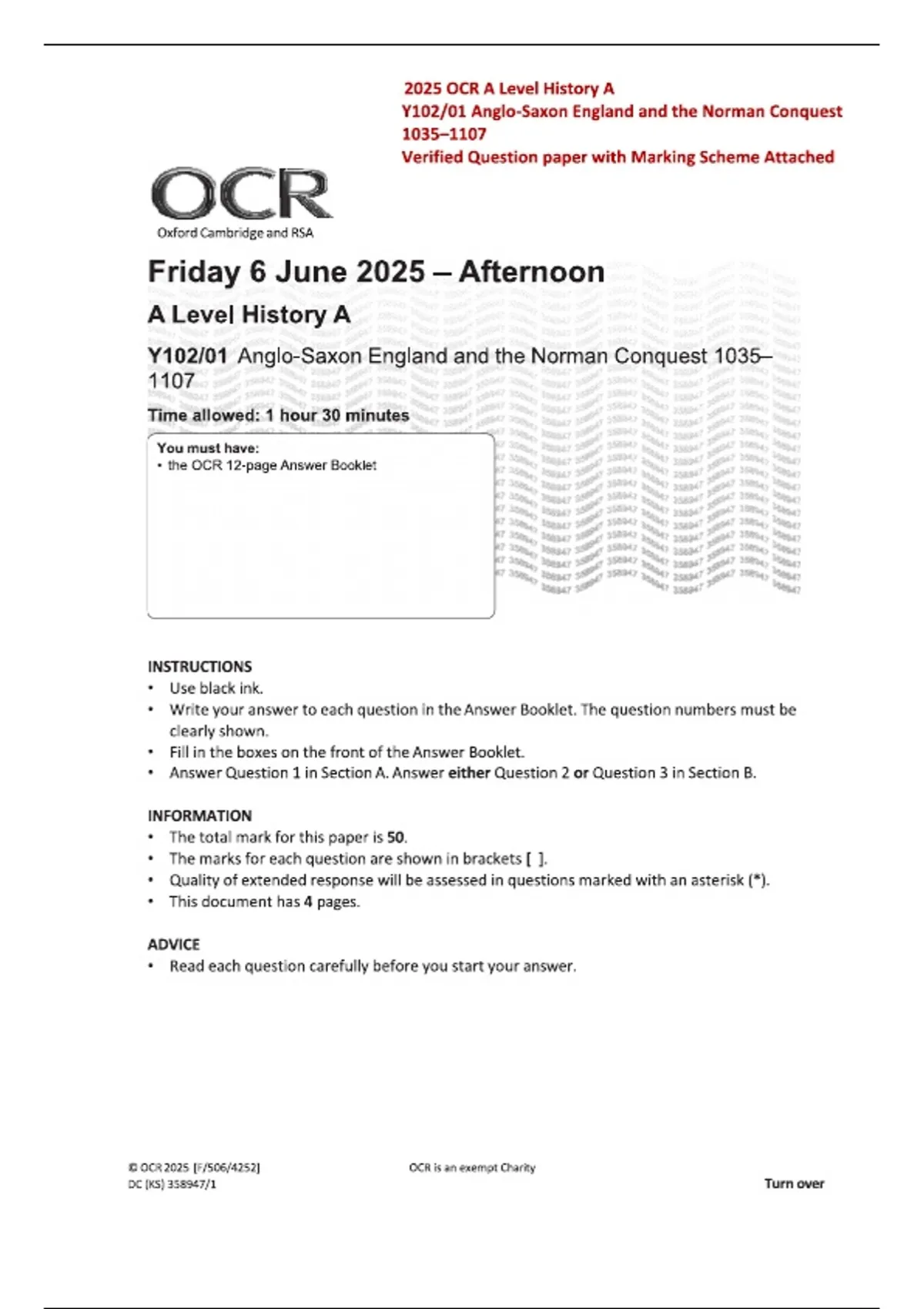OCR A Level 2025 History A Y102/01 Anglo-Saxon England and the Norman Conquest 1035–1107 Question Paper | Official with Marking Scheme & Fully Worked Answers