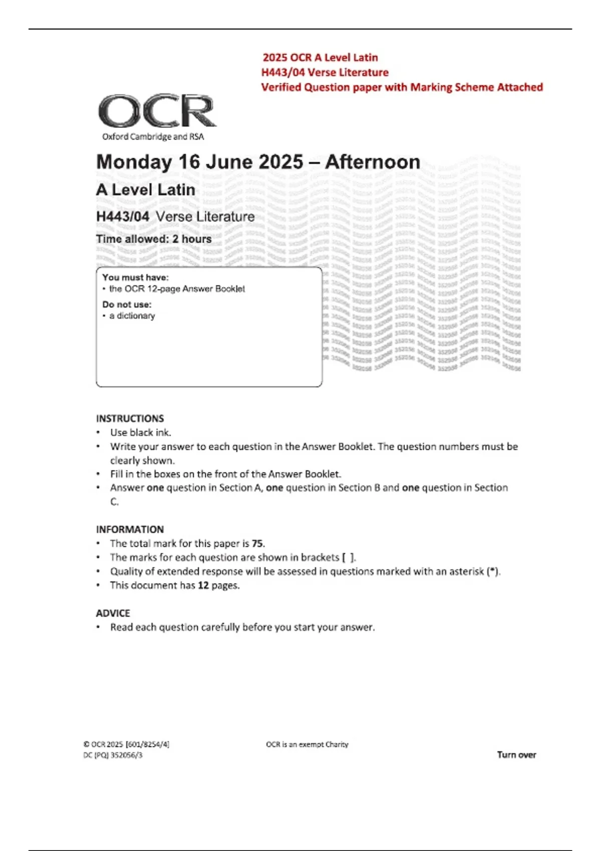 2025 OCR A Level Latin H443/04 Verse Literature Question Paper with Official Examiner Mark Scheme for Advanced Literary Analysis