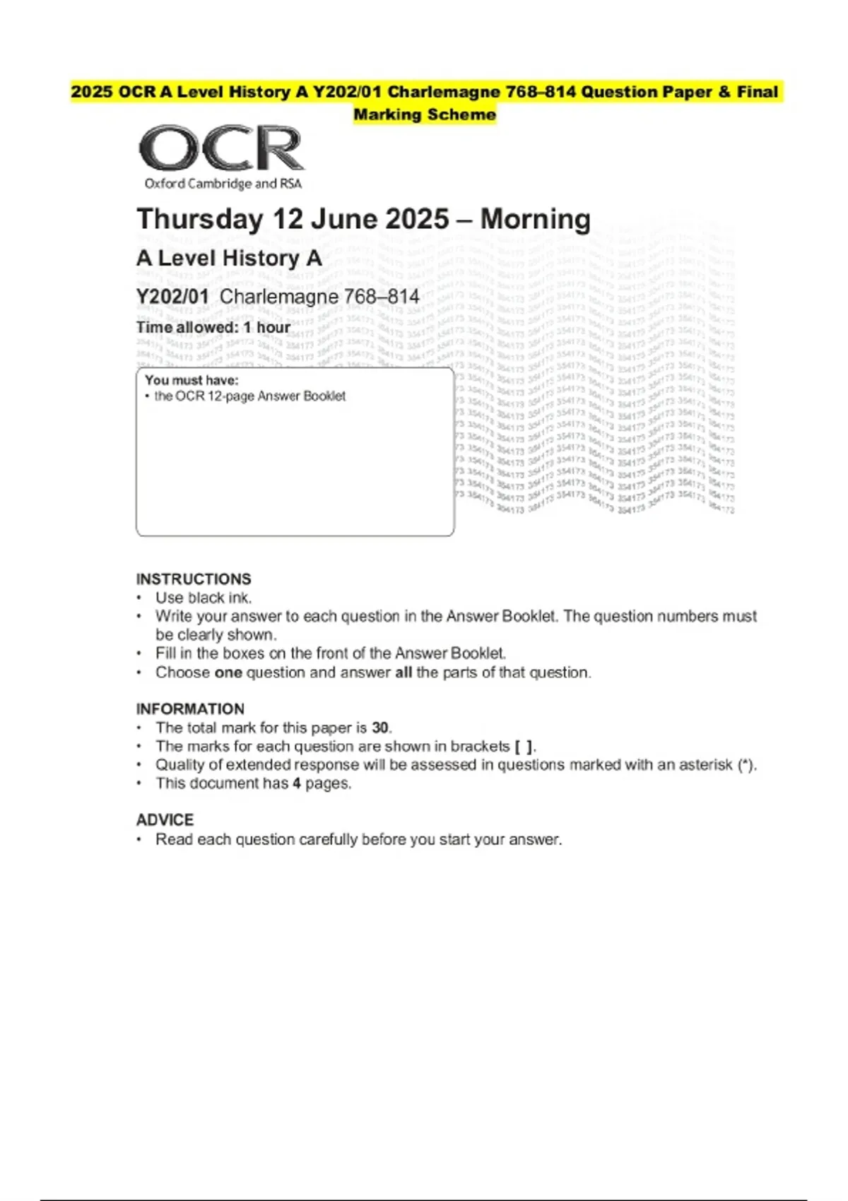 2025 OCR A Level History A Y202/01 Charlemagne 768–814 Question Paper and Marking Scheme