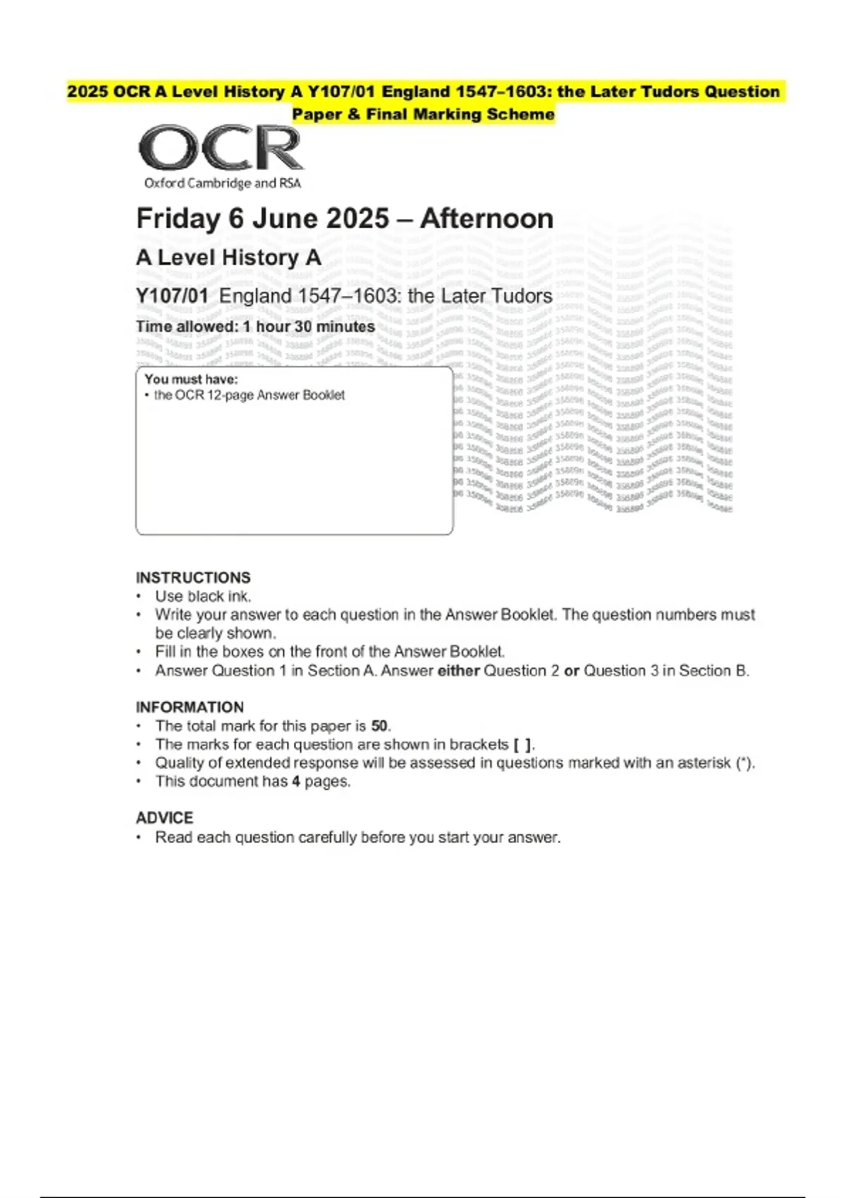 2025 OCR A Level History A Y107/01 England 1547–1603: the Later Tudors Question Paper and Marking Scheme