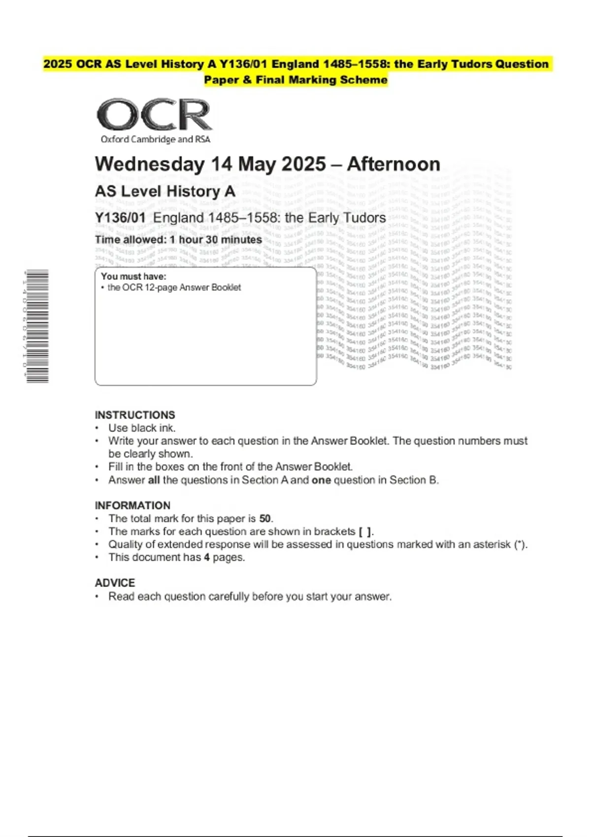 2025 OCR AS Level History A Y136/01 England 1485–1558: the Early Tudors Question Paper and Marking Scheme