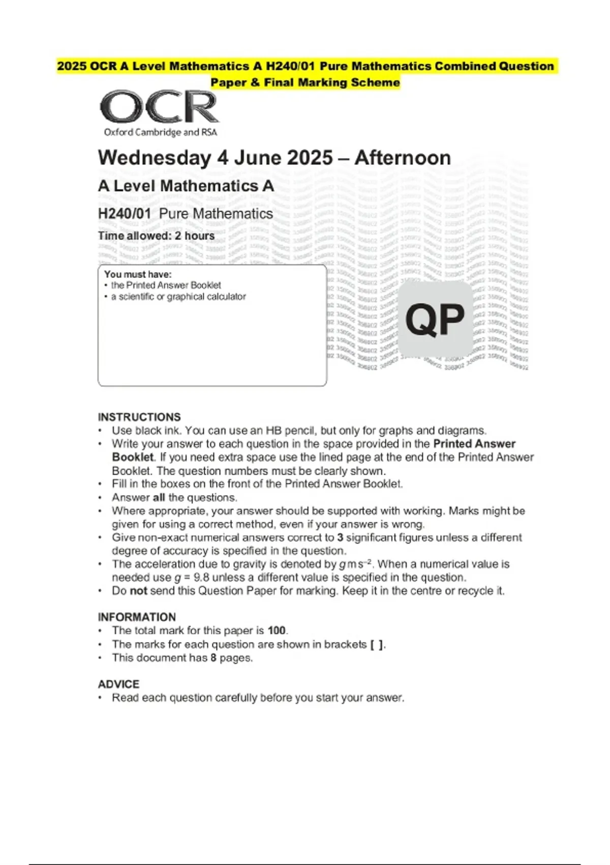 2025 OCR A Level Mathematics A H240/01 Pure Mathematics Combined Question Paper and Marking Scheme