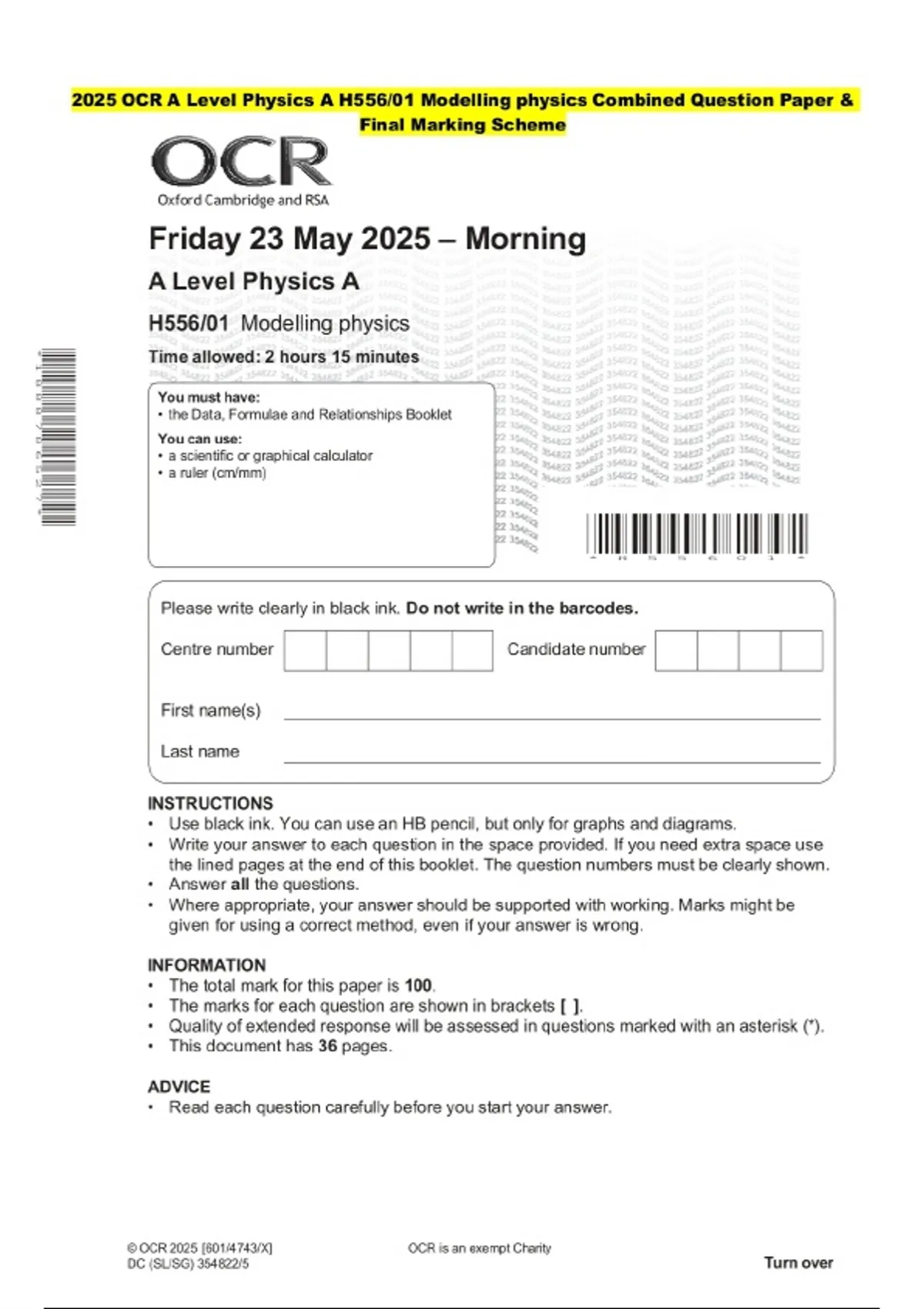 2025 OCR A Level Physics A H556/01 Modelling physics Combined Question Paper and Marking Scheme