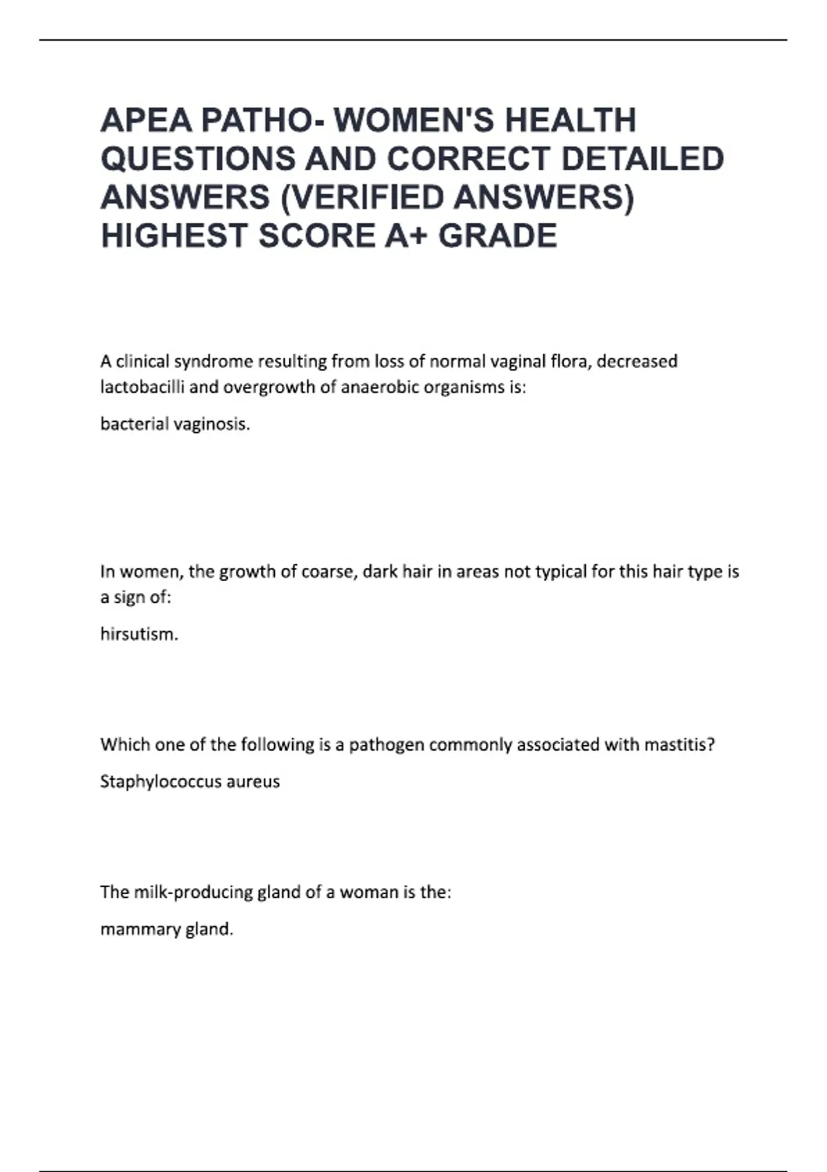 This resource provides a comprehensive APEA Pathophysiology study guide focused on Women’s Health, featuring verified questions and complete answers. It covers key topics including reproductive system disorders, maternal health, gynecological conditions, hormonal regulation, and disease management. Designed for nursing students and healthcare professionals, this guide supports exam preparation, self-assessment, and mastery of women’s health pathophysiology.