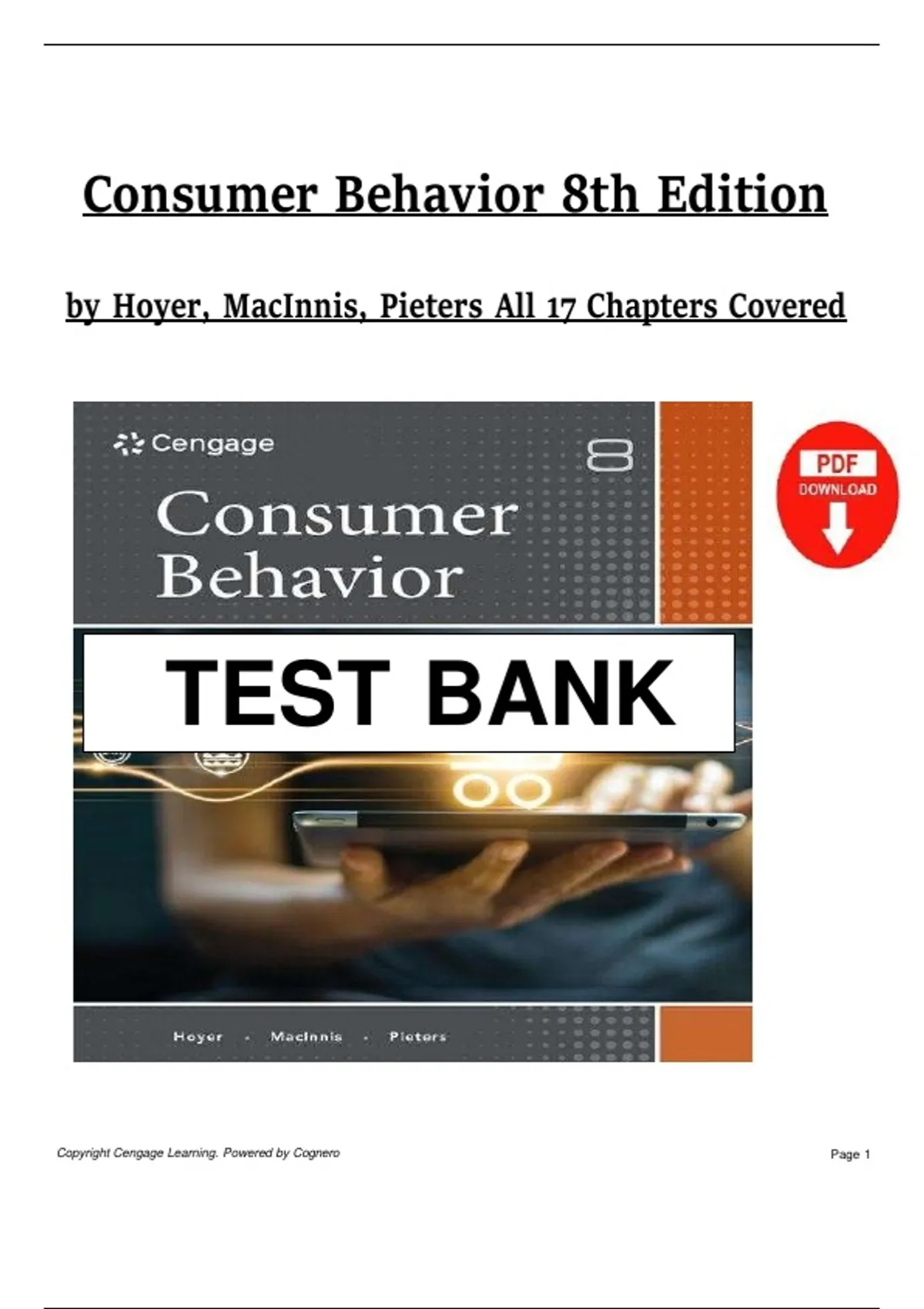 This test bank for the 8th edition of Consumer Behavior by Hoyer, MacInnis, and Pieters includes a comprehensive collection of multiple-choice, true/false, and scenario-based questions for all 17 chapters. Topics span motivation, perception, learning, attitude formation, decision-making, cultural influences, and post-purchase behavior. Designed to support academic success, this resource is ideal for students and instructors focusing on the psychological and social aspects of consumer behavior. consumer behavior Hoyer MacInnis Pieters 8th edition decision-making process motivation and perception learning and memory attitudes consumer culture psychological influences marketing strategy customer satisfaction test bank behavioral insights marketing psychology
