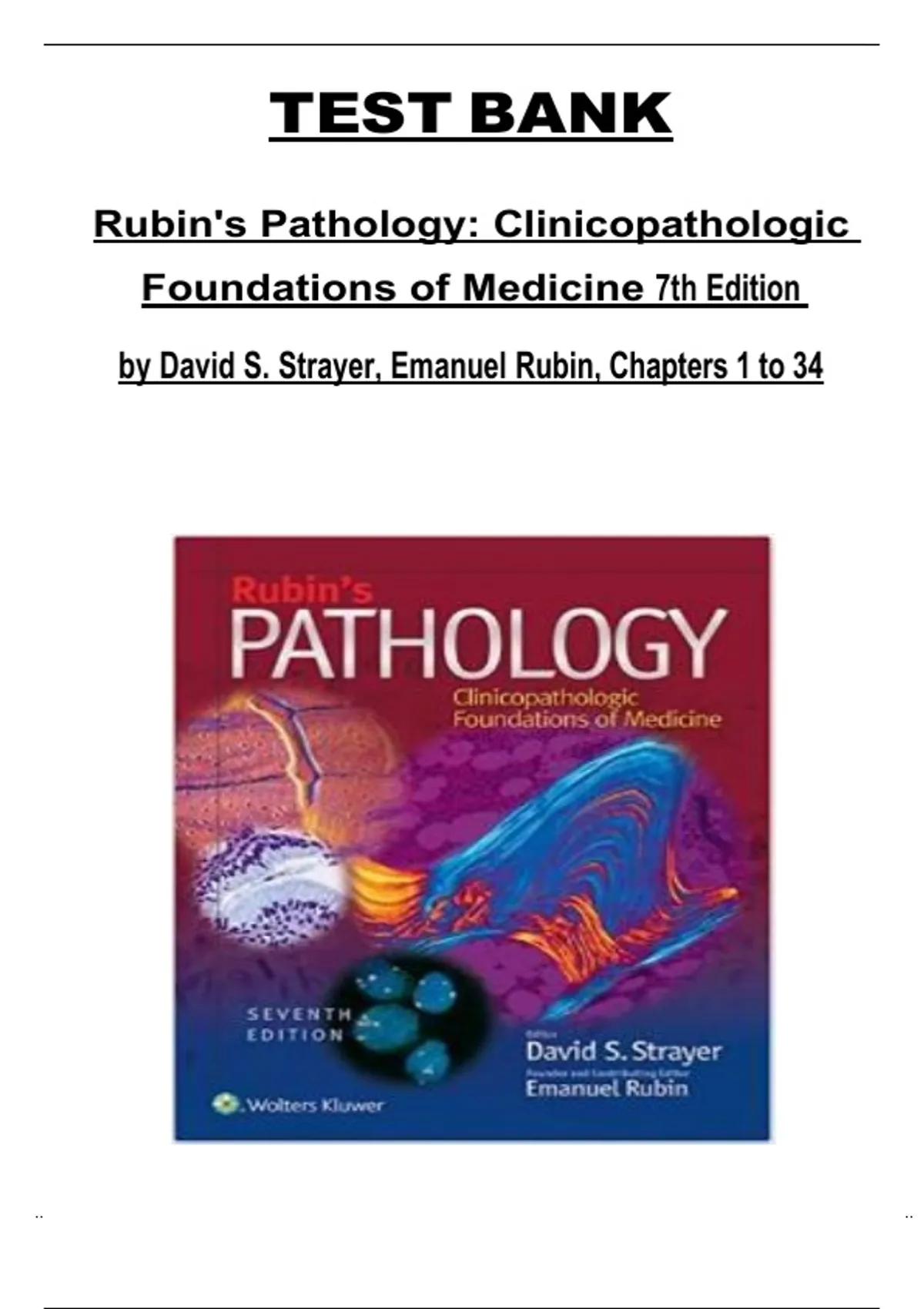 This document contains a comprehensive test bank for Rubin’s Pathology: Clinicopathologic Foundations of Medicine, 7th Edition by David S. Strayer and Emanuel Rubin, covering chapters 1 through 34. It includes exam-style questions with accurate answers focused on general and systemic pathology, disease mechanisms, morphologic changes, and clinicopathologic correlations, making it ideal for exams, quizzes, and in-depth medical or health sciences course review.