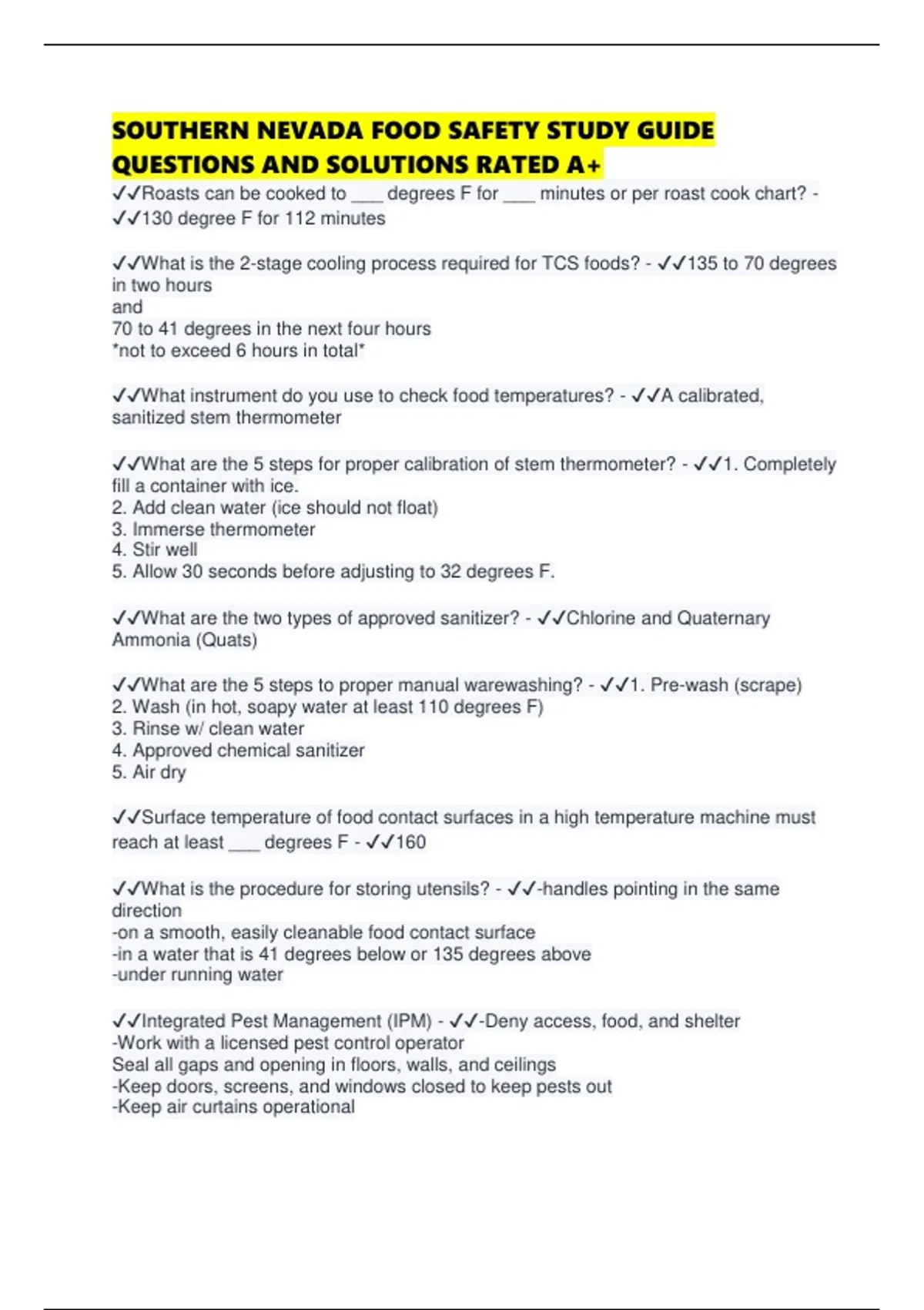 SOUTHERN NEVADA FOOD SAFETY STUDY GUIDE QUESTIONS AND SOLUTIONS RATED A+