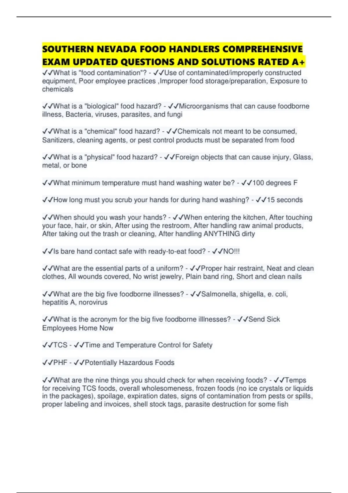 SOUTHERN NEVADA FOOD HANDLERS COMPREHENSIVE EXAM UPDATED QUESTIONS AND SOLUTIONS RATED A+