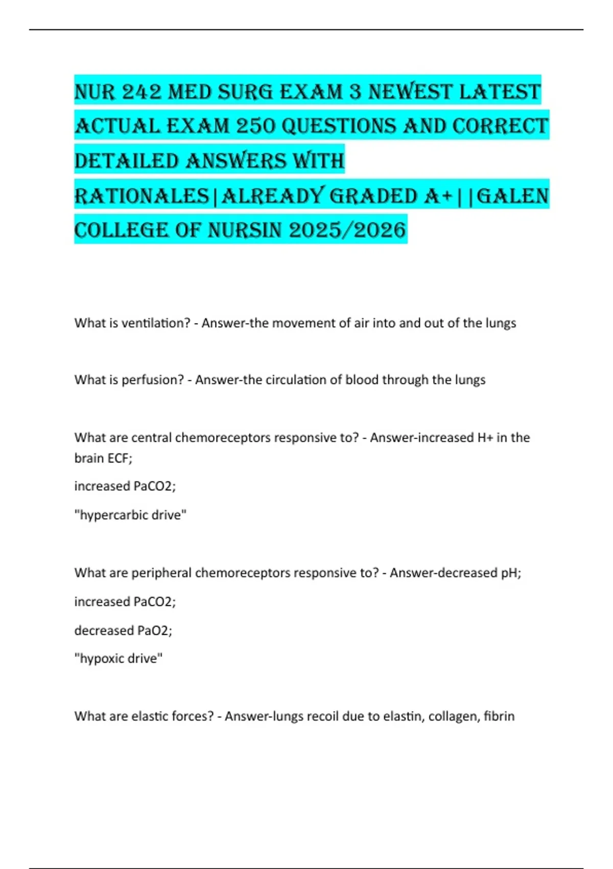 What is ventilation? - Answer-the movement of air into and out of the lungs What is perfusion? - Answer-the circulation of blood through the lungs What are central chemoreceptors responsive to? - Answer-increased H+ in the brain ECF; increased PaCO2; "hypercarbic drive" What are peripheral chemoreceptors responsive to? - Answer-decreased pH; increased PaCO2; decreased PaO2; "hypoxic drive" What are elastic forces? - Answer-lungs recoil due to elastin, collagen, fibrin What are surface forces? - Answer-surface tension due to water-air interface What is airway resistance? - Answer-opposition to flow caused by the forces of friction; primarily determined by airway radius What is the distensibility of the lungs? - Answer-ease with which the lungs can be inflated What factors affect lung perfusion? - Answer-lung cap