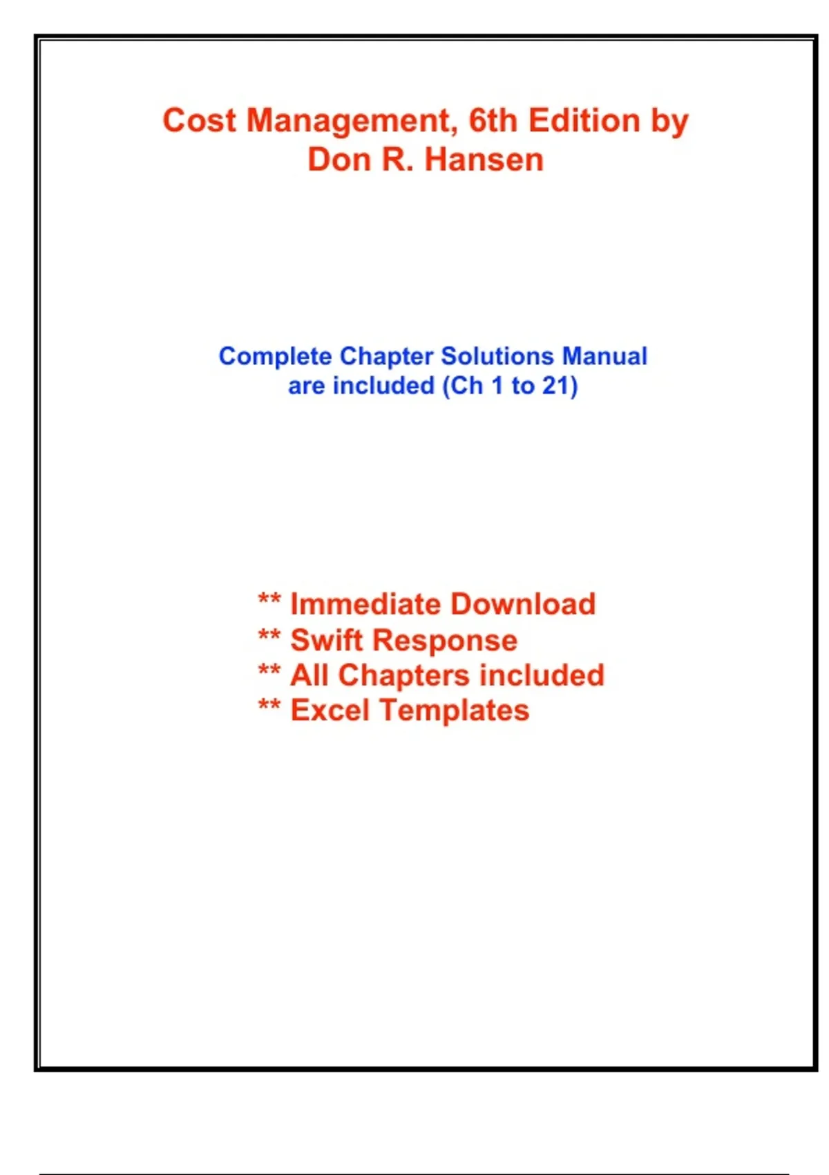 Complete Solutions Manual for Cost Management, 6th Edition by Don R. Hansen, Maryanne M. Mowen, Dan L. Heitger ; ISBN13: 9798214044866...(Full Chapters included from Chapter 1 to 21)...1. Introduction to Cost Management 2. Basic Cost Management Concepts 3. Cost Behavior and Forecasting 4. Unit-Based and Activity-Based Costing Systems 5. Job-Order Costing 6. Process Costing 7. Allocating Costs of Support Departments and Joint Products 8. Budgeting for Planning and Control 9. Standard Costing: A Functional-Based Control Approach 10. Decentralization: Responsibility Accounting, Performance Evaluation, and Transfer Pricing 11. Strategic Cost Management 12. Activity-Based Management 13. Strategic-Based Control Systems and the Balanced Scorecard 14. Quality and Environmental Cost Management 15. Lean Accounting and Productivity Measurement 16. Cost-Volume-Profit Analysis 17. Activity Resource Usage Model and Tactical Decision Making 18. Pricing and Profitability Analysis 19. Capital Investment 20. Inventory Management: Economic Order Quantity, JIT, and the Theory of Constraints 21. International Issues in Cost Management