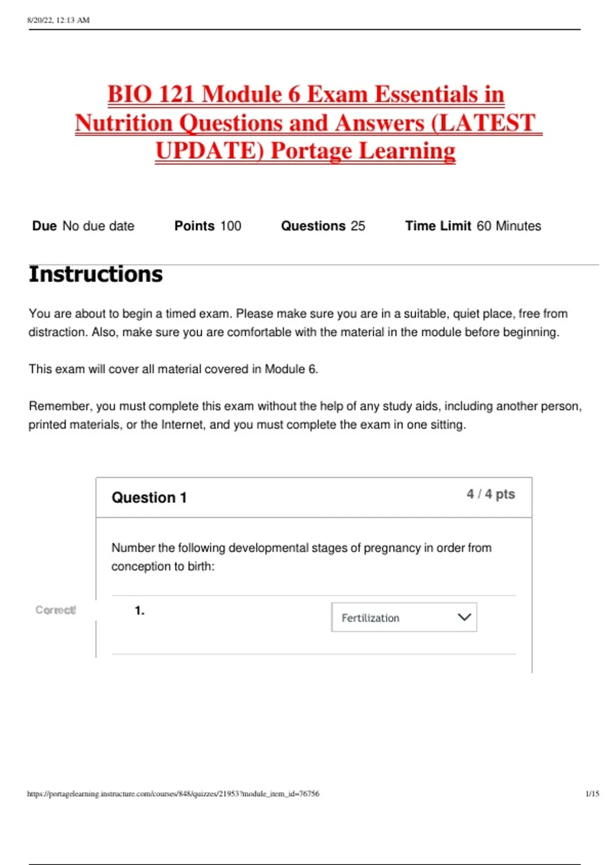 BIO 121 Module 6 Exam Essentials in Nutrition Questions and Answers (LATEST UPDATE) Portage Learning