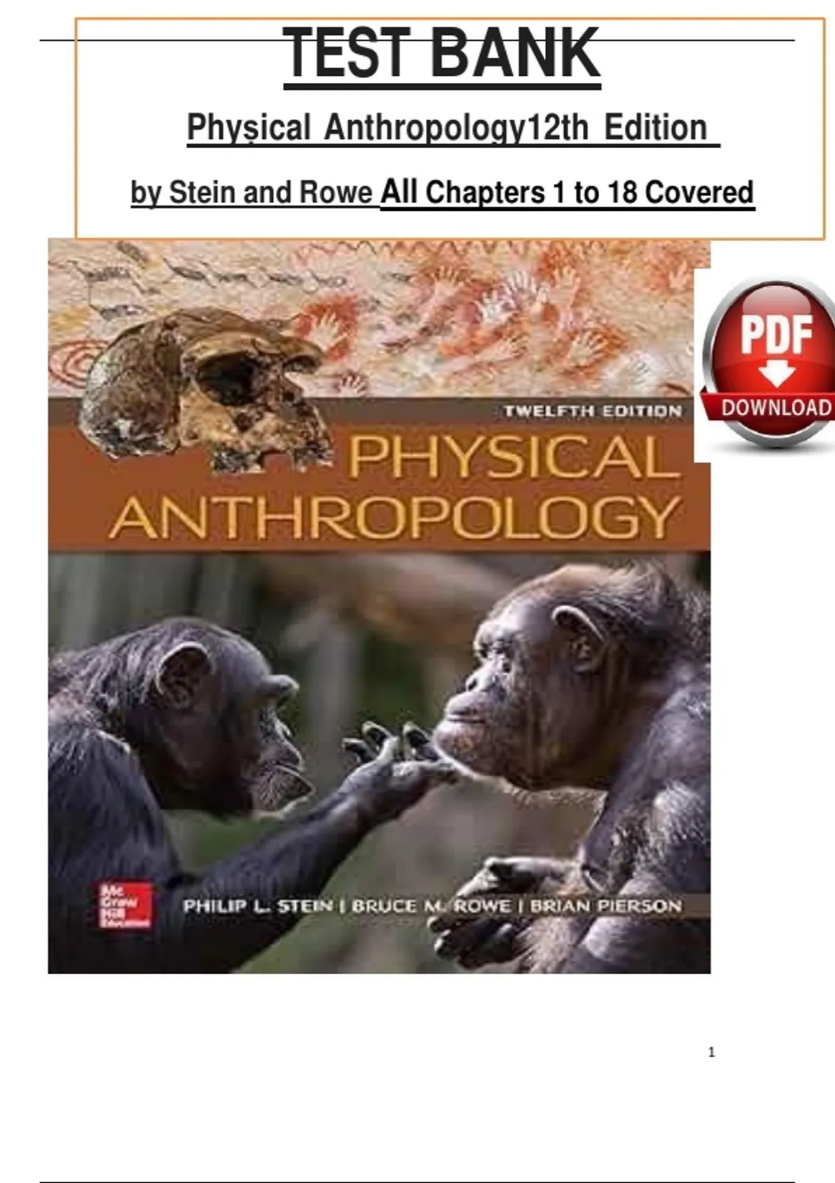 This document is the complete test bank for Physical Anthropology, 12th Edition by Philip L. Stein and Bruce M. Rowe, covering all Chapters 1 through 18. It includes extensive true/false, multiple-choice, and essay questions with verified answer keys addressing human evolution, genetics, population variation, primatology, fossil records, hominin evolution, modern human biology, and contemporary issues in physical anthropology.The material is ideal for undergraduate anthropology courses, exam preparation, instructor resources, and comprehensive review aligned with standard biological and physical anthropology curricula.