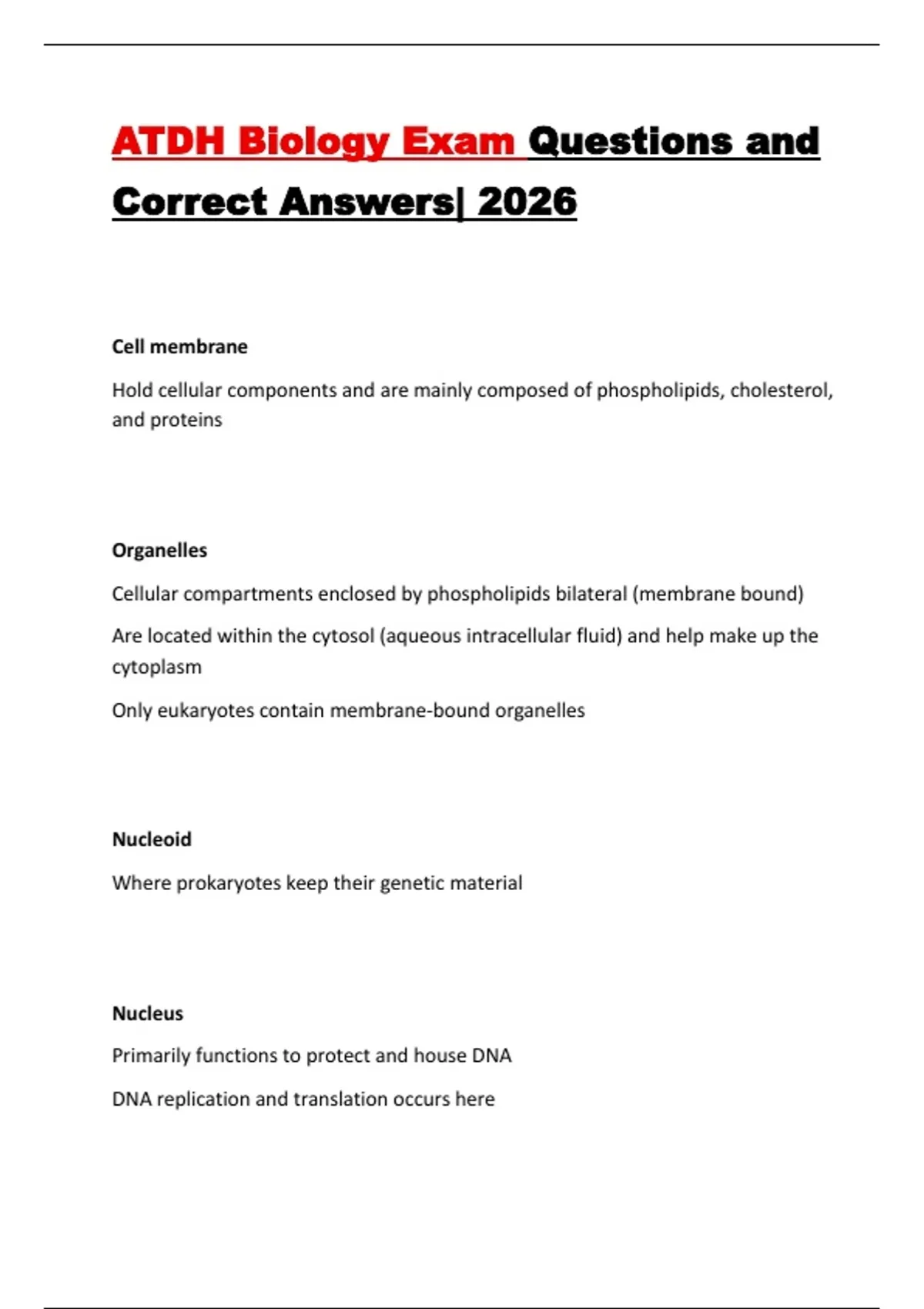 This document is the latest updated ATDH Biology exam study guide containing biology exam questions with correct answers and clear explanations aligned with current ATDH testing standards. It covers all major biology topics tested on the ATDH, including cell biology, biomolecules, enzymes, metabolism, genetics, microbiology, immunology, evolution, ecology, and human anatomy and physiology relevant to dental hygiene education. The material is structured to support efficient studying, concept reinforcement, and confident exam performance for ATDH candidates.
