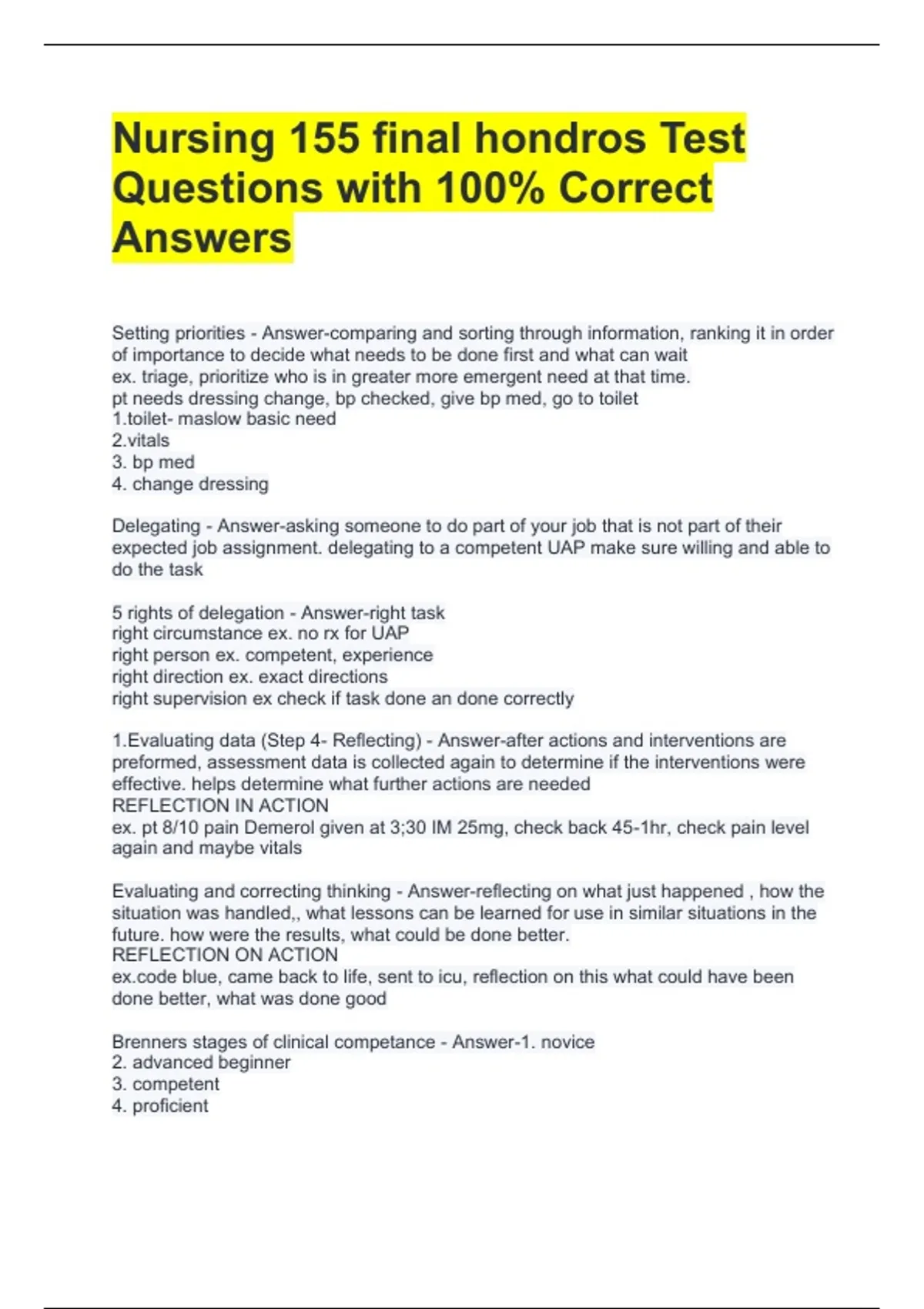 Nursing 155 final hondros Test Questions with 100% Correct Answers