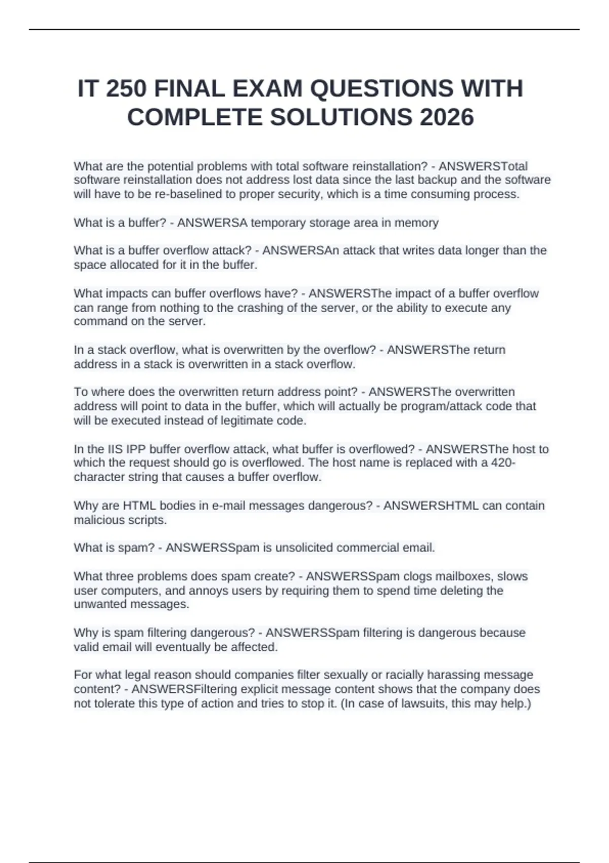 What are the potential problems with total software reinstallation? - ANSWERSTotal software reinstallation does not address lost data since the last backup and the software will have to be re-baselined to proper security, which is a time consuming process. What is a buffer? - ANSWERSA temporary storage area in memory What is a buffer overflow attack? - ANSWERSAn attack that writes data longer than the space allocated for it in the buffer. What impacts can buffer overflows have? - ANSWERSThe impact of a buffer overflow can range from nothing to the crashing of the server, or the ability to execute any command on the server. In a stack overflow, what is overwritten by the overflow? - ANSWERSThe return address in a stack is overwritten in a stack overflow. To where does the overwritten return address point? - ANSWERSThe overwritten address will point to data in the buffer, which will actually be program/attack code that will be executed instead of legitimate code. In the IIS IPP buffer overflow attack, what buffer is overflowed? - ANSWERSThe host to which the request should go is overflowed. The host name is replaced with a 420-character string that causes a buffer overflow. Why are HTML bodies in e-mail messages dangerous? - ANSWERSHTML can contain malicious scripts. What is spam? - ANSWERSSpam is unsolicited commercial email. What three problems does spam create? - ANSWERSSpam clogs mailboxes, slows user computers, and annoys users by requiring them to spend time deleting the unwanted messages.