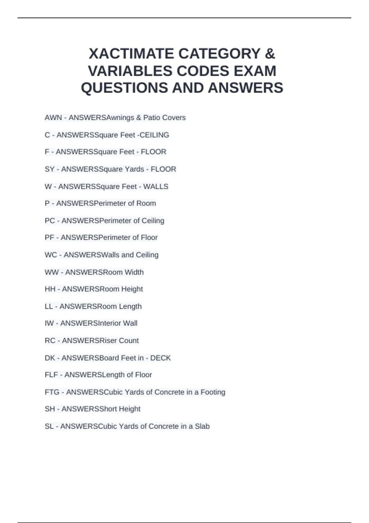 XACTIMATE CATEGORY & VARIABLES CODES EXAM QUESTIONS AND ANSWERS