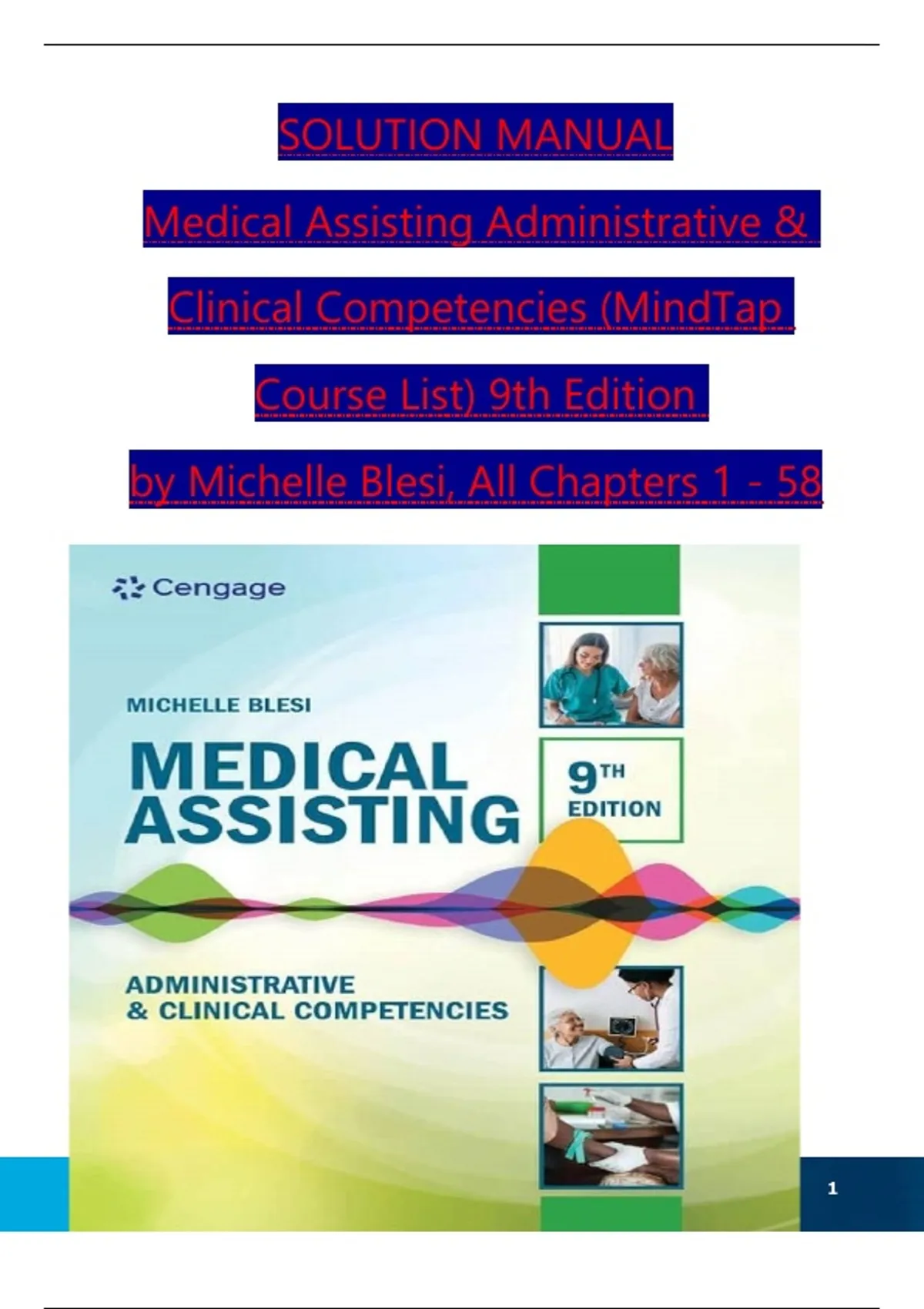 Succeed in medical assisting coursework with this comprehensive Solution Manual for Medical Assisting: Administrative & Clinical Competencies, 9th Edition by Michelle Blesi. Designed for medical assisting students, this resource provides clear, step-by-step solutions to reinforce both administrative and clinical competencies required for academic and professional success. This solution manual includes: Detailed worked solutions for end-of-chapter exercises and review questions Coverage of administrative competencies such as medical office management, billing and coding, insurance processing, scheduling, and legal/ethical issues Coverage of clinical competencies including patient care, infection control, vital signs, clinical procedures, and safety Ideal for homework, assignments, quizzes, midterms, finals, and certification preparation Updated for Latest 2026 exam prep Designed to support Graded A+ performance An essential study companion for mastering medical assisting skills and excelling in coursework and exams