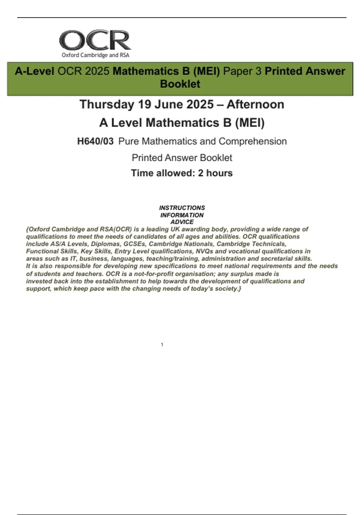 A-Level OCR 2025 Mathematics B (MEI) Paper 3 Printed Answer Booklet