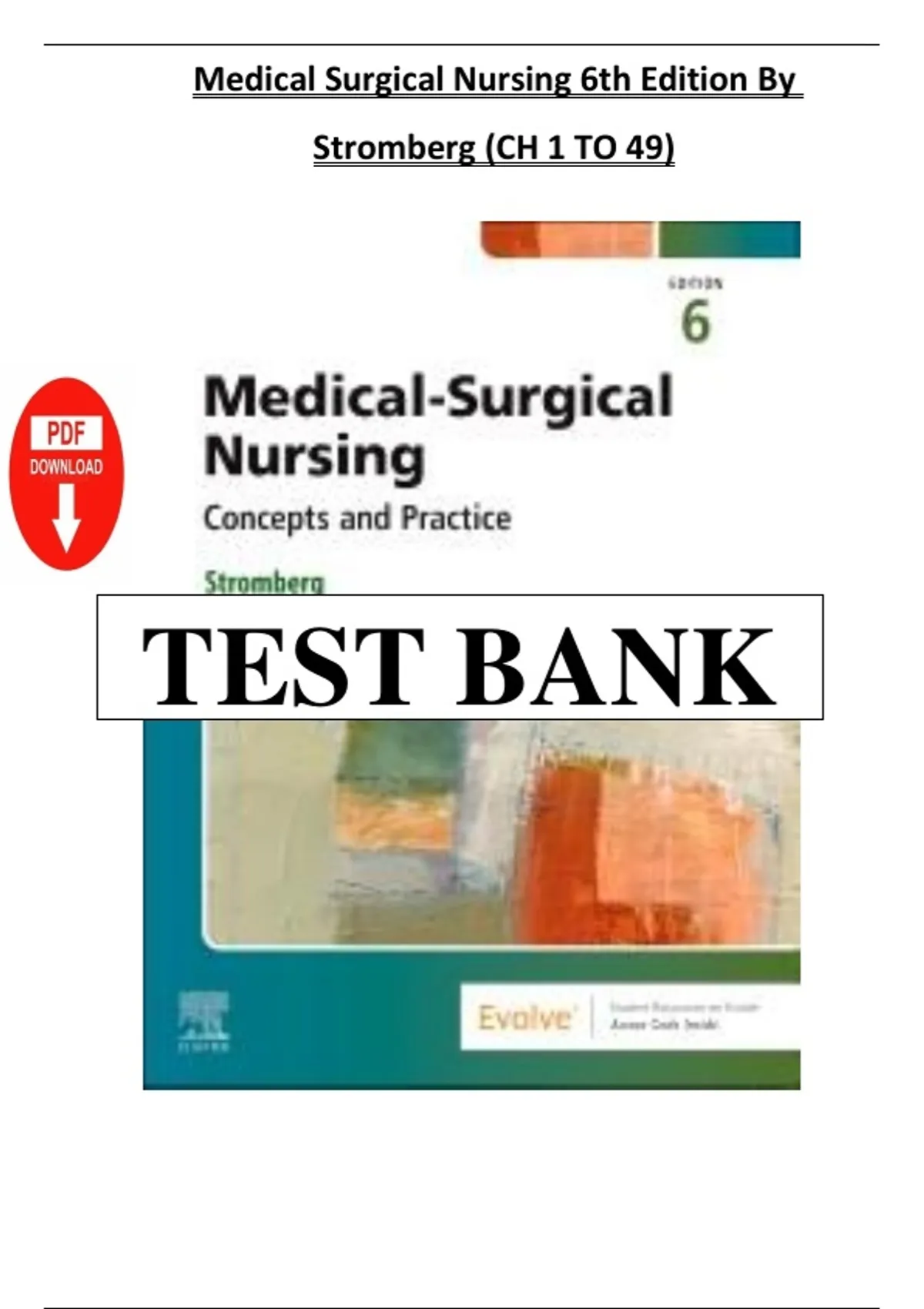 This document is the complete test bank for Medical-Surgical Nursing: Concepts and Practice, 6th Edition by Stromberg, covering all 49 chapters in full. It includes extensive multiple-choice and multiple-response questions with verified answers addressing foundational medical-surgical nursing care, critical thinking and the nursing process, fluid and electrolyte balance, perioperative care, infection control, pain management, oncology, end-of-life care, and comprehensive system-based nursing care across respiratory, cardiovascular, neurologic, gastrointestinal, musculoskeletal, endocrine, renal, integumentary, emergency, and mental health conditions.The material is ideal for medical-surgical nursing students, instructors, and NCLEX preparation, fully aligned with contemporary med-surg nursing curricula and clinical practice standards.