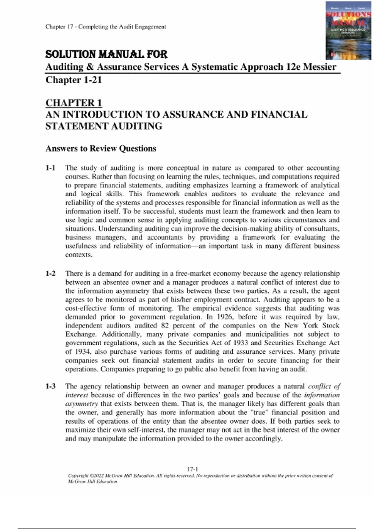 Solutions Manual for Auditing & Assurance Services: A Systematic Approach, 12th Edition by Messier, Glover & Prawitt | Verified Solutions | Latest Update 2025/2026 | A+ Graded