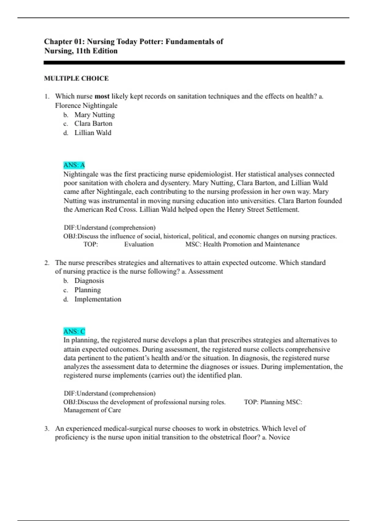Chapter 01: Nursing Today Potter: Fundamentals of Nursing, 11th Edition MULTIPLE CHOICE 1. Which nurse most likely kept records on sanitation techniques and the effects on health? a. Florence Nightingale b. Mary Nutting c. Clara Barton d. Lillian Wald ANS: A Nightingale was the first practicing nurse epidemiologist. Her statistical analyses connected poor sanitation with cholera and dysentery. Mary Nutting, Clara Barton, and Lillian Wald came after Nightingale, each contributing to the nursing profession in her own way. Mary Nutting was instrumental in moving nursing education into universities. Clara Barton founded the American Red Cross. Lillian Wald helped open the Henry Street Settlement. DIF:Understand (comprehension) OBJ:Discuss the influence of social, historical, political, and economic changes on nursing practices. TOP: Evaluation MSC: Health Promotion and Maintenance 2. The nurse prescribes strategies and alternatives to attain expected outcome. Which standard of nursing practice is the nurse following? a. Assessment b. Diagnosis c. Planning d. Implementation ANS: C In planning, the registered nurse develops a plan that prescribes strategies and alternatives to attain expected outcomes. During assessment, the registered nurse collects comprehensive data pertinent to the patient’s health and/or the situation. In diagnosis, the registered nurse analyzes the assessment data to determine the diagnoses or issues. During implementation, the registered nurse implements (carries out) the identified plan. DIF:Understand (comprehension) OBJ:Discuss the development of professional nursing roles. TOP: Planning MSC: Management of Care 3. An experienced medical-surgical nurse chooses to work in obstetrics. Which level of proficiency is the nurse upon initial transition to the obstetrical floor? a. Novice b. Proficient c. Competent d. Advanced beginner ANS: A A beginning nursing student or any nurse entering a situation in which there is no previous level of experience (e.g., an experienced operating room nurse chooses to now practice in home health) is an example of a novice nurse. A proficient nurse perceives a patient’s clinical situation as a whole, is able to assess an entire situation, and can readily transfer knowledge gained from multiple previous experiences to a situation. A competent nurse understands the organization and specific care required by the type of patients (e.g., surgical, oncology, or orthopedic patients). This nurse is a competent practitioner who is able to anticipate nursing care and establish long-range goals. A nurse who has had some level of experience with the situation is an advanced beginner. This experience may only be observational in nature, but the nurse is able to identify meaningful aspects or principles of nursing care. DIF:Apply (application) OBJ:Discuss the development of professional nursing roles. TOP: Evaluation MSC: Management of Care 4. A nurse assesses a patient’s fluid status and decides that the patient needs to drink more fluids. The nurse then encourages the patient to drink more fluids. Which concept is the nurse demonstrating? a. Licensure b. Autonomy c. Certification d. Accountability ANS: B Autonomy is an essential element of professional nursing that involves the initiation of independent nursing interventions without medical orders. To obtain licensure in the United States, the RN candidate must pass the NCLEX-RN. Beyond the NCLEX-RN, the nurse may choose to work toward certification in a specific area of nursing practice. Accountability means that you are responsible, professionally and legally, for the type and quality of nursing care provided. DIF:Apply (application) OBJ:Discuss the roles and career opportunities for nurses. TOP: Implementation MSC: Management of Care 5. A nurse prepares the budget and policies for an intensive care unit. Which role is the nurse implementing? a. Educator b. Manager c. Advocate d. Caregiver ANS: B A manager coordinates the activities of members of the nursing staff in delivering nursing care and has personnel, policy, and budgetary responsibility for a specific nursing unit or facility. As an educator, you explain concepts and facts about health, describe the reason for routine care activities, demonstrate procedures such as self-care activities, reinforce learning or patient behavior, and evaluate the patient’s progress in learning. As a patient advocate, you protect your patient’s human and legal rights and provide assistance in asserting these rights if the need arises. As a caregiver, you help patients maintain and regain health, manage disease and symptoms, and attain a maximal level function and independence through the healing process. DIF:Apply (application) OBJ:Discuss the roles and career opportunities for nurses. TOP: Implementation MSC: Management of Care 6. The nurse has been working in the clinical setting for several years as an advanced practice nurse. However, the nurse has a strong desire to pursue research and theory development. To fulfill this desire, which program should the nurse attend? a. Doctor of Nursing Science degree (DNSc) b. Doctor of Philosophy degree (PhD) c. Doctor of Nursing Practice degree (DNP) d. Doctor in the Science of Nursing degree (DSN) ANS: B Some doctoral programs prepare nurses for more rigorous research and theory development and award the research-oriented Doctor of Philosophy (PhD) in nursing. Professional doctoral programs in nursing (DSN or DNSc) prepare graduates to apply research findings to clinical nursing. The DNP is a practice doctorate that prepares advanced practice nurses such as nurse practitioners. DIF:Understand (comprehension) OBJ:Compare and contrast the educational programs available for professional registered nurse (RN) education. TOP: Teaching/Learning MSC: Management of Care 7. A nurse attends a workshop on current nursing issues provided by the American Nurses Association. Which type of education did the nurse rece