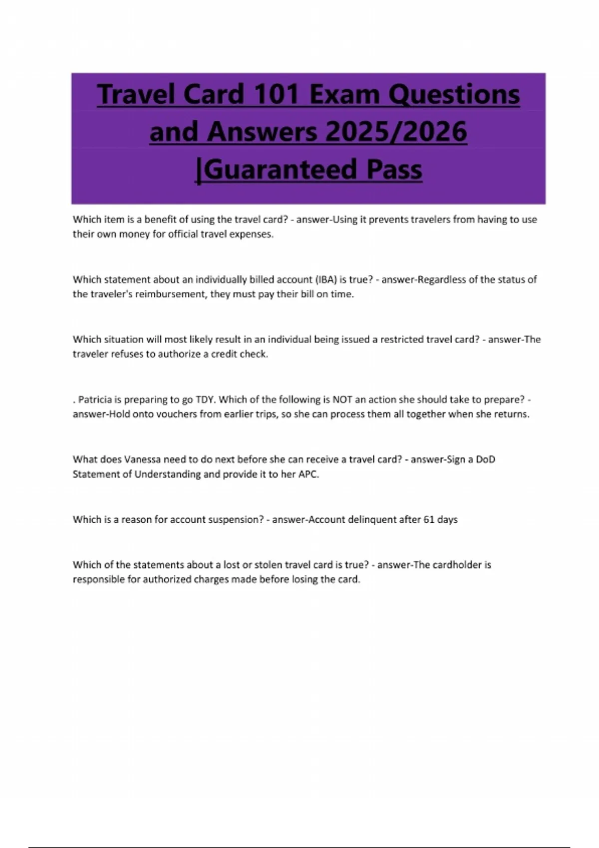 Travel Card 101 Exam Questions and Answers 2025/2026 |Guaranteed Pass Which item is a benefit of using the travel card? - answer-Using it prevents travelers from having to use their own money for official travel expenses. Which statement about an individually billed account (IBA) is true? - answer-Regardless of the status of the traveler's reimbursement, they must pay their bill on time. Which situation will most likely result in an individual being issued a restricted travel card? - answer-The traveler refuses to authorize a credit check. . Patricia is preparing to go TDY. Which of the following is NOT an action she should take to prepare? - answer-Hold onto vouchers from earlier trips, so she can process them all together when she returns. What does Vanessa need to do next before she can receive a travel card? - answer-Sign a DoD Statement of Understanding and provide it to her APC. Which is a reason for account suspension? - answer-Account delinquent after 61 days