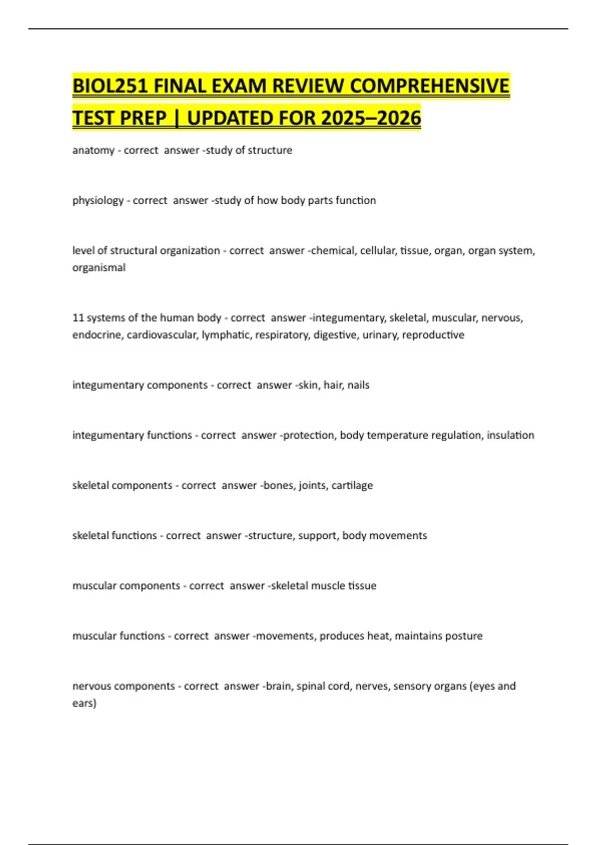 BIOL251 FINAL EXAM REVIEW COMPREHENSIVE TEST PREP | UPDATED FOR 2025–2026