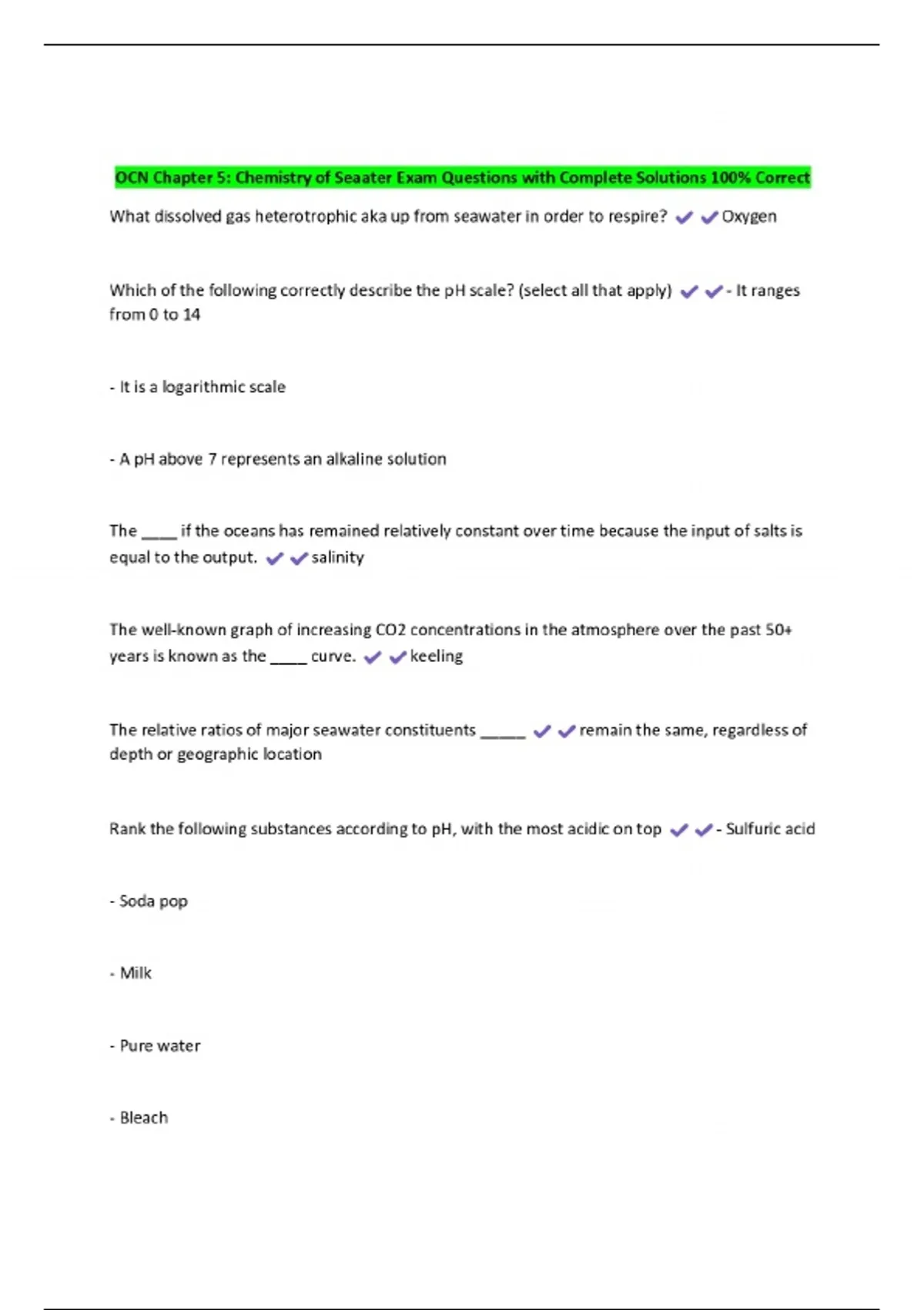 OCN Chapter 5: Chemistry of Seaater Exam Questions with Complete Solutions 100% Correct