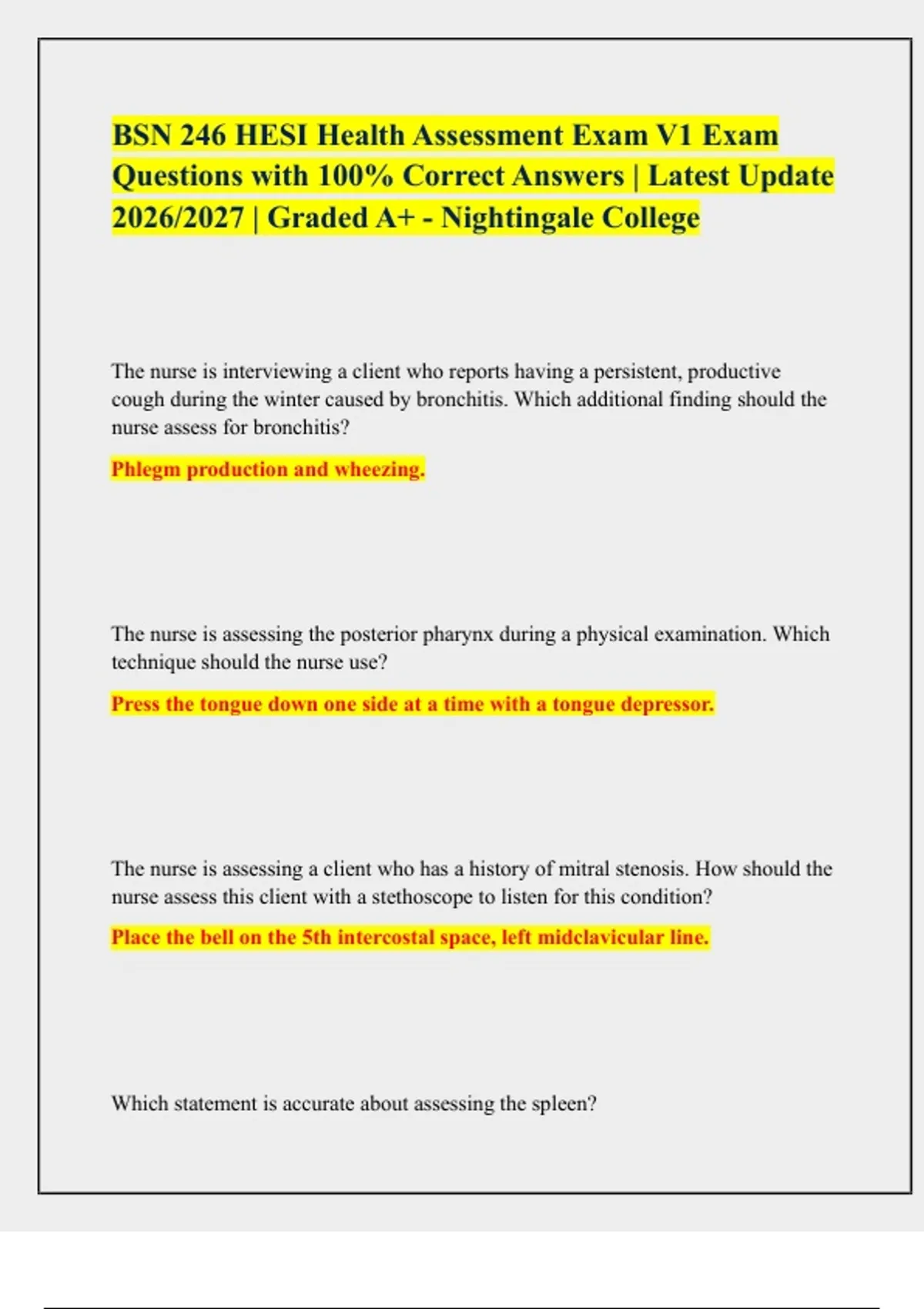 BSN 246 HESI Health Assessment Exam V1 Exam Questions with 100% Correct Answers | Latest Update 2026/2027 | Graded A+ - Nightingale College. The nurse is interviewing a client who reports having a persistent, productive cough during the winter caused by bronchitis. Which additional finding should the nurse assess for bronchitis? Phlegm production and wheezing. The nurse is assessing the posterior pharynx during a physical examination. Which technique should the nurse use? Press the tongue down one side at a time with a tongue depressor. The nurse is assessing a client who has a history of mitral stenosis. How should the nurse assess this client with a stethoscope to listen for this condition? Place the bell on the 5th intercostal space, left midclavicular line. Which statement is accurate about assessing the spleen? It must be enlarged at least three times normal size for it to be palpable. During an external examination of the eyes, the nurse gently palpates the eyes while the client's eyelids are closed. The eyes are both very firm and resist movement back into the orbit. How should the nurse document this finding? Abnormal finding. The nurse is assessing a client with liver disease who is jaundice and exhibits scleral edema. During the health assessment, the nurse should implement which technique to determine evidence of hepatomegaly? Use a bouncing motion to tap the middle finger placed within boundaries of the liver. What is the best nursing response to an older client who has not mentioned incontinence during a genitourinary assessment? Ask the client specifically about any leakage of urine. The registered nurse (RN) is caring for an Asian client who refuses to make eye contact during conversations. How should the RN assess this client's response? The client is treating the nurse with respect. The nurse is assessing a client for a hip flexion contracture. Which finding indicates a negative Thomas test when the client's right knee is brought toward the chest? The left leg remains on the table *The Thomas test is performed by having the client bring one knee toward the chest while the other leg remains extended on the table. A positive Thomas test is elicited when the extended leg rises off the table when the opposite leg's knee is brought up to the client's chest, indicating hip flexor contracture. If the extended leg (the left leg, in this example) remains on the table, the test is negative. Which tool should the nurse use when assessing the neurological status of a client with traumatic brain injury? Glasgow Coma Scale. The nurse is assessing a client who has a history of aortic regurgitation. Where should the nurse place the stethoscope diaphragm to listen for this condition? 2nd intercostal space along the right sternal border. The nurse is assessing a client who has experienced a sudden onset of hearing loss in the right ear. Which finding should alert the nurse to a potentially serious medical condition that requires further evaluation? There is no sign of associated infection. Which information should the nurse obtain to identify the client's self-perception of health status? Health history During the initial assessment, the nurse notes that a client has blurred vision with cloudy lenses. Which condition should the nurse document? Cataracts. A client with dark skin is reporting a painful and itching area on the lower left leg. What should the nurse look for when assessing this client's skin for inflammation? Change in consistency.