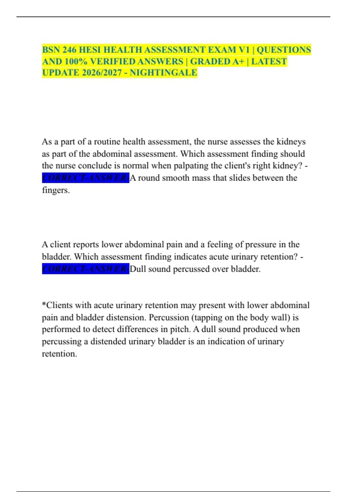 BSN 246 HESI HEALTH ASSESSMENT EXAM V1 | QUESTIONS AND 100% VERIFIED ANSWERS | GRADED A+ | LATEST UPDATE 2026/2027 - NIGHTINGALE. As a part of a routine health assessment, the nurse assesses the kidneys as part of the abdominal assessment. Which assessment finding should the nurse conclude is normal when palpating the client's right kidney? - CORRECT-ANSWER-A round smooth mass that slides between the fingers. A client reports lower abdominal pain and a feeling of pressure in the bladder. Which assessment finding indicates acute urinary retention? - CORRECT-ANSWER-Dull sound percussed over bladder. *Clients with acute urinary retention may present with lower abdominal pain and bladder distension. Percussion (tapping on the body wall) is performed to detect differences in pitch. A dull sound produced when percussing a distended urinary bladder is an indication of urinary retention. The nurse examines the skin of an older adult client. Which skin variation is considered a normal finding for a client in this age group? - CORRECT-ANSWER-Lentigines. *Lentigines or commonly referred to as liver spots are irregularly shaped dark spots on the skin caused by aging and extensive sun exposure. This skin variation is a normal finding in an older adult client. During a client's routine well-woman physical exam, the nurse examines the breasts. Which assessment technique should the nurse implement to evaluate for any abnormal lumps? - CORRECT-ANSWERWith both arms at client's side, lift one arm and palpate the axilla. A client has come to the clinic for a routine health assessment. What is the best assessment question for the nurse to ask a client after observing tophi on the client's ear cartilage? - CORRECT-ANSWER-Have you had sudden and severe pain in the toes or feet? During the interview portio of the health assessment, a nurse notes the person's posture, physical appearance, and ability to converse. How should the nurse document these findings? - CORRECTANSWERObjective.