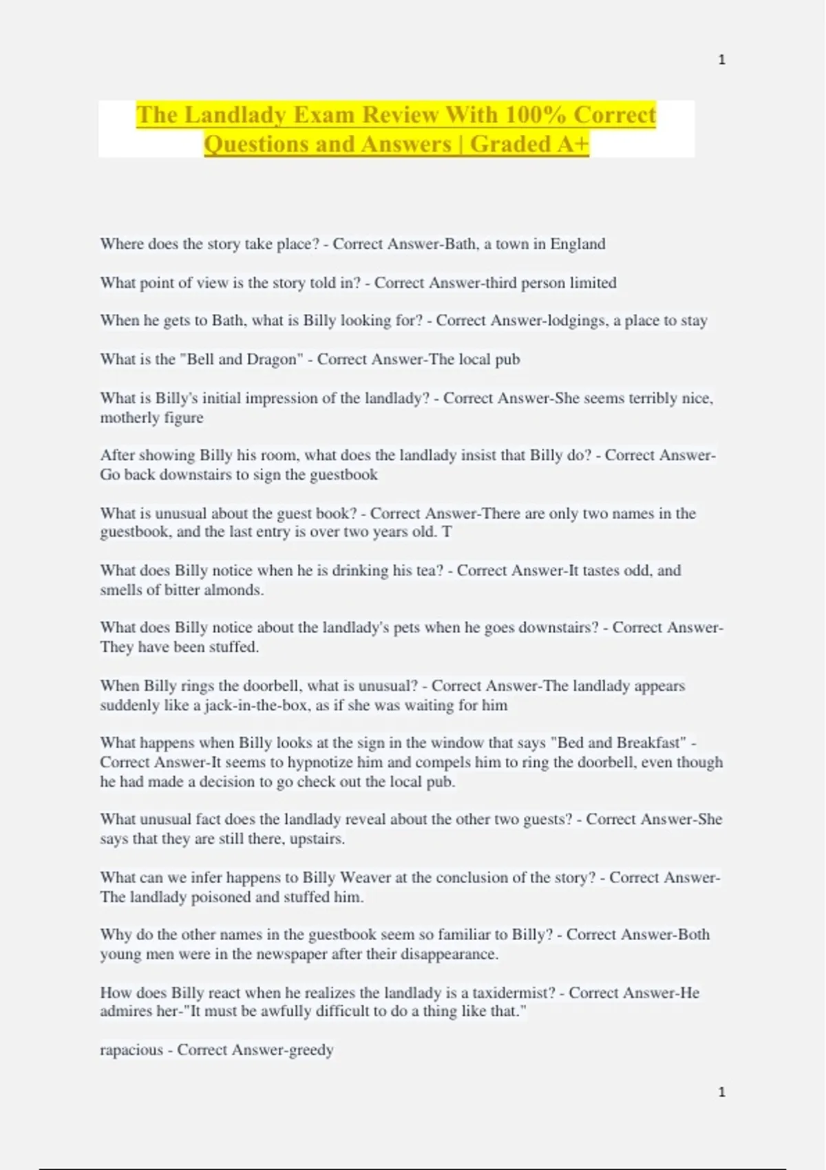 The Landlady Exam Review With 100% Correct