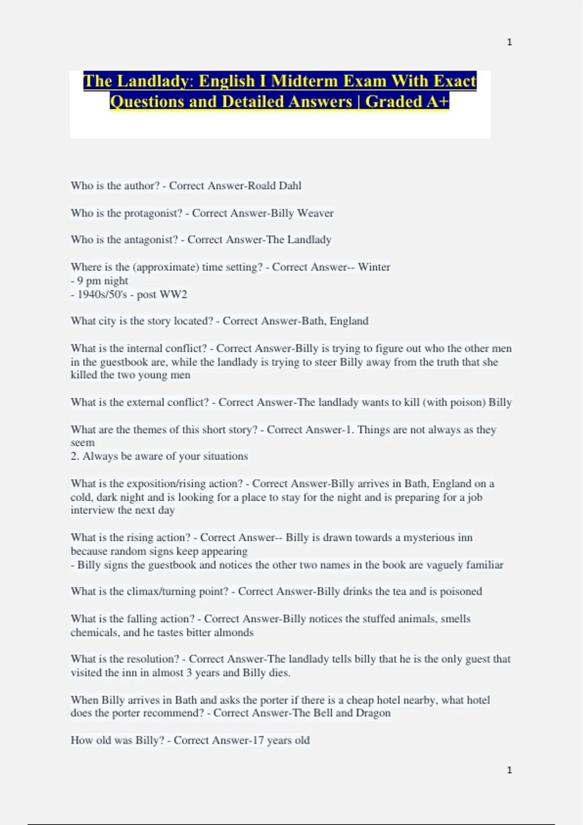 What is the resolution? - Correct Answer-The landlady tells billy that he is the only guest that