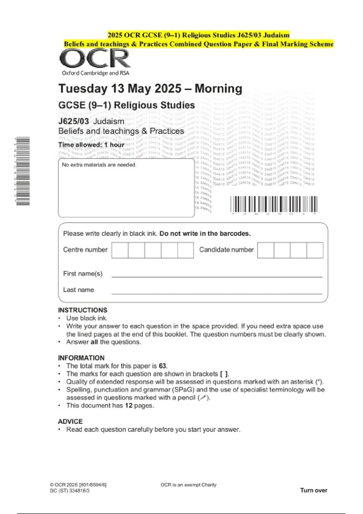 2025 OCR GCSE (9–1) Religious Studies J625/03 Judaism Beliefs and teachings & Practices Examination Paper and Final Marking Scheme