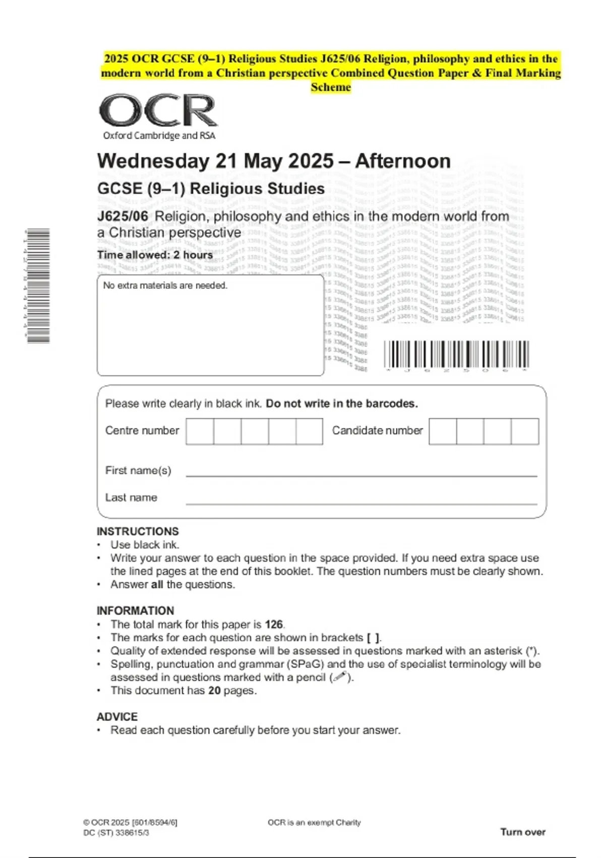 2025 OCR GCSE (9–1) Religious Studies J625/06 Religion, philosophy and ethics in the modern world from a Christian perspective Examination Paper and Final Marking Scheme