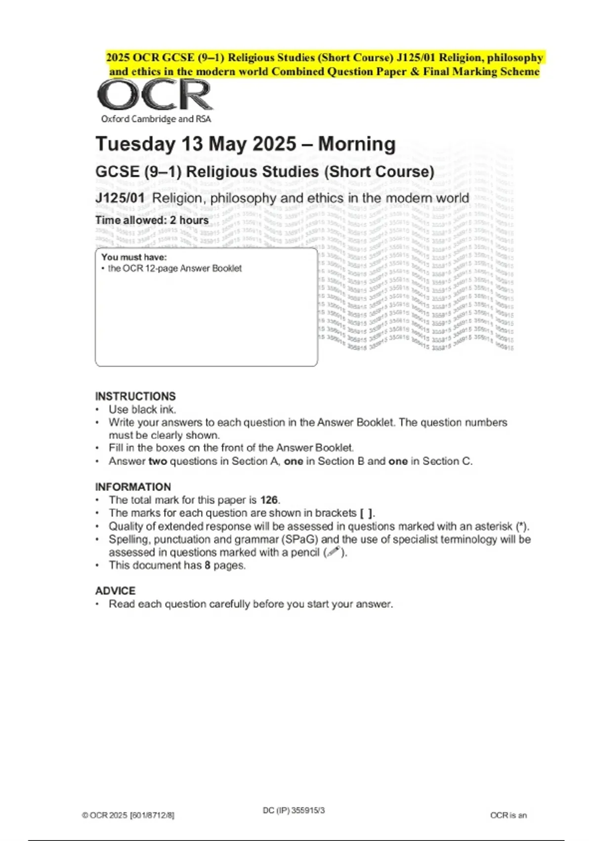 2025 OCR GCSE (9–1) Religious Studies (Short Course) J125/01 Religion, philosophy and ethics in the modern world Examination Paper and Final Marking Scheme