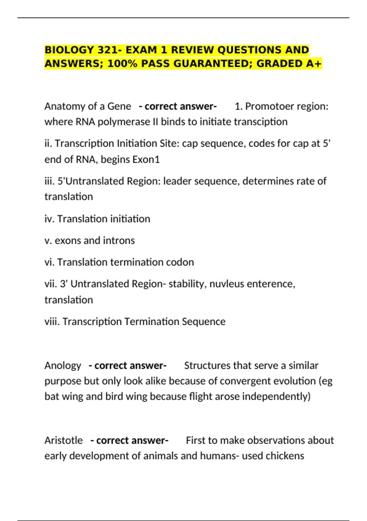 BIOLOGY 321- EXAM 1 REVIEW QUESTIONS AND