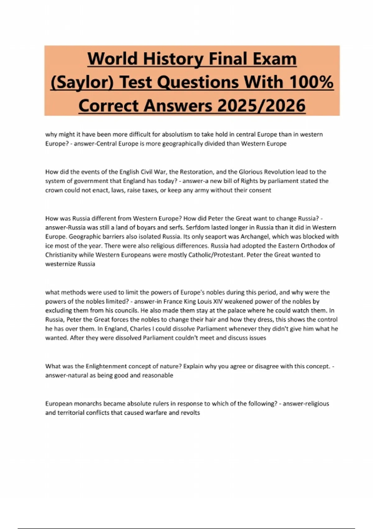 World History Final Exam (Saylor) Test Questions With 100% Correct Answers 2025/2026 why might it have been more difficult for absolutism to take hold in central Europe than in western Europe? - answer-Central Europe is more geographically divided than Western Europe How did the events of the English Civil War, the Restoration, and the Glorious Revolution lead to the system of government that England has today? - answer-a new bill of Rights by parliament stated the crown could not enact, laws, raise taxes, or keep any army without their consent How was Russia different from Western Europe? How did Peter the Great want to change Russia? - answer-Russia was still a land of boyars and serfs. Serfdom lasted longer in Russia than it did in Western Europe. Geographic barriers also isolated Russia. Its only seaport was Archangel, which was blocked with ice most of the year. There were also religious differences. Russia had adopted the Eastern Orthodox of Christianity while Western Europeans were mostly Catholic/Protestant. Peter the Great wanted to westernize Russia what methods were used to limit the powers of Europe's nobles during this period, and why were the powers of the nobles limited? - answer-in France King Louis XIV weakened power of the nobles by excluding them from his councils. He also made them stay at the palace where he could watch them. In Russia, Peter the Great forces the nobles to change their hair and how they dress, this shows the control he has over them. In England, Charles I could dissolve Parliament whenever they didn't give him what he wanted. After they were dissolved Parliament couldn't meet and discuss issues What was the Enlightenment concept of nature? Explain why you agree or disagree with this concept. - answer-natural as being good and reasonable European monarchs became absolute rulers in response to which of the following? - answer-religious and territorial conflicts that caused warfare and revolts
