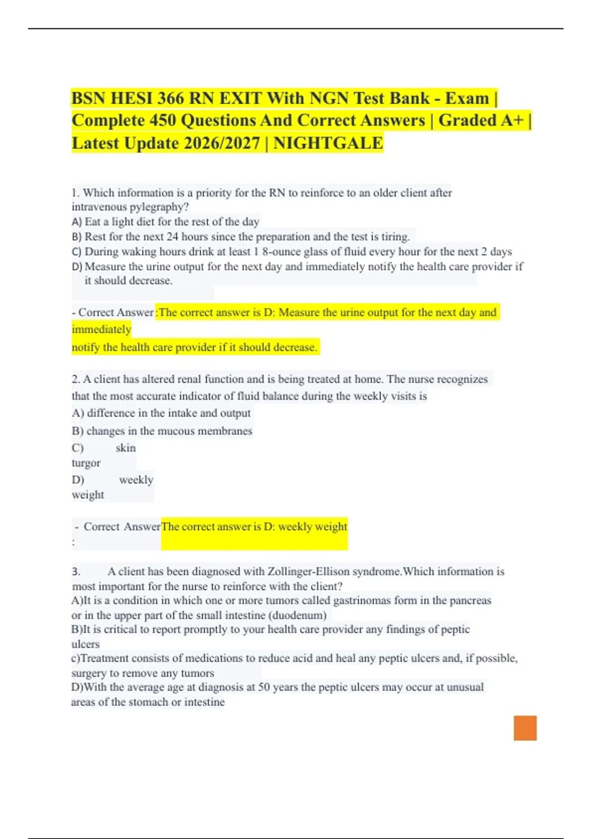 BSN HESI 366 RN EXIT With NGN Test Bank - Exam | Complete 450 Questions And Correct Answers | Graded A+ | Latest Update 2026/2027 | NIGHTGALE. 1. Which information is a priority for the RN to reinforce to an older client after intravenous pylegraphy? A) Eat a light diet for the rest of the day B) Rest for the next 24 hours since the preparation and the test is tiring. C) During waking hours drink at least 1 8-ounce glass of fluid every hour for the next 2 days D) Measure the urine output for the next day and immediately notify the health care provider if it should decrease. - Correct Answer :The correct answer is D: Measure the urine output for the next day and immediately notify the health care provider if it should decrease. 2. A client has altered renal function and is being treated at home. The nurse recognizes that the most accurate indicator of fluid balance during the weekly visits is A) difference in the intake and output B) changes in the mucous membranes C) skin turgor D) weekly weight - Correct Answer : The correct answer is D: weekly weight 3. A client has been diagnosed with Zollinger-Ellison syndrome.Which information is most important for the nurse to reinforce with the client? A)It is a condition in which one or more tumors called gastrinomas form in the pancreas or in the upper part of the small intestine (duodenum) B)It is critical to report promptly to your health care provider any findings of peptic ulcers c)Treatment consists of medications to reduce acid and heal any peptic ulcers and, if possible, surgery to remove any tumors D)With the average age at diagnosis at 50 years the peptic ulcers may occur at unusual areas of the stomach or intestine - Correct Answer : The correct answer is B: It is critical to report promptly to your health care provider any findings of peptic ulcers. 4. A primigravida in the third trimester is hospitalized for preeclampsia. The nurse determines that the client's blood pressure is increasing. Which action should the nurse take first? A) Check the protein level in urine B) Have the client turn to the left side C) Take the temperature D) Monitor the urine output - Correct Answer : The correct answer is B: Have the client turn to the left side 5. The nurse is caring for a client in atrial fibrillation. The atrial heart rate is 250 and the ventricular rate is controlled at 75. Which of the following findings is cause for the most concern? A) Diminished bowel sounds B) Loss of appetite C) A cold, pale lower leg D) Tachypnea - Correct Answer : The correct answer is C: A cold, pale lower leg 6. The client with infective endocarditis must be assessed frequently by the home health nurse. Which finding suggests that antibiotic therapy is not effective, and must be reported by the nurse immediately to the healthcare provider? A) Nausea and vomiting B) Fever of 103 degrees Fahrenheit (39.5 degrees Celsius) C) Diffuse macular rash D) Muscle tenderness - Correct Answer :The correct answer is B: Fever of 103 degrees F (39.5 degrees C) 7. 8. A client who is to have antineoplastic chemotherapy tells the nurses of a fear of being sick all the time and wishes to try acupuncture. Which of these beliefs stated by the client would be incorrect about acupuncture? A)Some needles go as deep as 3 inches, depending on where they're placed in the body and what the treatment is for. The needles usually are left in for 15 to 30 minutes. B) In traditional Chinese medicine, imbalances in the basic energetic flow of life — known as qi or chi — are thought to cause illness. * C) The flow of life is believed to flow through major pathways or nerve clusters in your body. D) By inserting extremely fine needles into some of the over 400 acupuncture points in various combinations it is believed that energy flow will rebalance to allow the body's natural healing mechanisms to take over. - Correct Answer :The correct answer is C: The flow of life is believed to flow through major pathways or nerve clusters in your body. 9. The nurse is discussing with a group of students the disease Kawasaki. What statement made by a student about Kawasaki disease is incorrect? A)It also called mucocutaneous lymph node syndrome because it affects the mucous membranes (inside the mouth, throat and nose), skin and lymph nodes. B)In the second phase of the disease, findings include peeling of the skin on the hands and feet with joint and abdominal pain C)Kawasaki disease occurs most often in boys, children younger than age 5 and children of Hispanic descent D)Initially findings are a sudden high fever, usually above 104 degrees Fahrenheit, which lasts 1 to 2 weeks - Correct Answer : The correct answer is C: Kawasaki disease occurs most often in boys, children younger than age 5 and children of Hispanic descent 10. A client has viral pneumonia affecting 2/3 of the right lung. What would be the best position to teach the client to lie in every other hour during first 12 hours after admission? A) Side-lying on the left with the head elevated 10 degrees B) Side-lying on the left with the head elevated 35 degrees C) Side-lying on the right with the head elevated 10 degrees D) Side-lying on the right with the head elevated 35 degrees - Correct Answer :The correct answer is A: Side-lying on the left with the head elevated 10 degrees 11. A client has an indwelling catheter with continuous bladder irrigation after undergoing a transurethral resection of the prostate (TURP) 12 hours ago. Which finding at this time should be reported to the health care provider? A) Light, pink urine B) occasional suprapubic cramping C) minimal drainage into the urinary collection bag D) complaints of the feeling of pulling on the urinary catheter - Correct Answer :The correct answer is C: minimal drainage into the urinary collection bag 12. A nurse is performing CPR on an adult who went into cardiopulmonary arrest. Another nurse enters the room in response to the call. After checking the client's pulse and respirations,