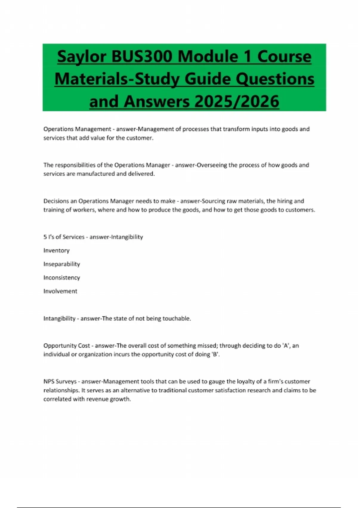 Saylor BUS300 Module 1 Course Materials-Study Guide Questions and Answers 2025/2026 Operations Management - answer-Management of processes that transform inputs into goods and services that add value for the customer. The responsibilities of the Operations Manager - answer-Overseeing the process of how goods and services are manufactured and delivered. Decisions an Operations Manager needs to make - answer-Sourcing raw materials, the hiring and training of workers, where and how to produce the goods, and how to get those goods to customers. 5 I's of Services - answer-Intangibility Inventory Inseparability Inconsistency Involvement Intangibility - answer-The state of not being touchable. Opportunity Cost - answer-The overall cost of something missed; through deciding to do 'A', an individual or organization incurs the opportunity cost of doing 'B'. NPS Surveys - answer-Management tools that can be used to gauge the loyalty of a firm's customer relationships. It serves as an alternative to traditional customer satisfaction research and claims to be correlated with revenue growth.Examples of considerations service operators consider - answer-Improving overall quality through measuring consumer satisfaction, planning facilities for optimal use of space, and effective scheduling Strategy - answer-A plan of action intended to accomplish a specific goal. Tactic - answer-A maneuver or action calculated to achieve some end. Goal of Operations Management - answer-to convert materials and labor into goods and services as efficiently and effectively as possible, while also controlling costs to maximize profits Three basic types of processes - answer-made-to-order, mass production, and mass customization Made-to-order - answer-Involves goods that are customized to specific consumer requests, such as signs made by print shops. Mass production - answer-When large numbers of identical products are made at low cost and are priced so that many customers can buy those goods. Mass customization - answer-When large numbers of goods are produced at affordable prices, but can also be tailored to meet individual customer preferences such as shoes and apparel, which allow shoppers to make adjustments to meet their fit and taste requirements