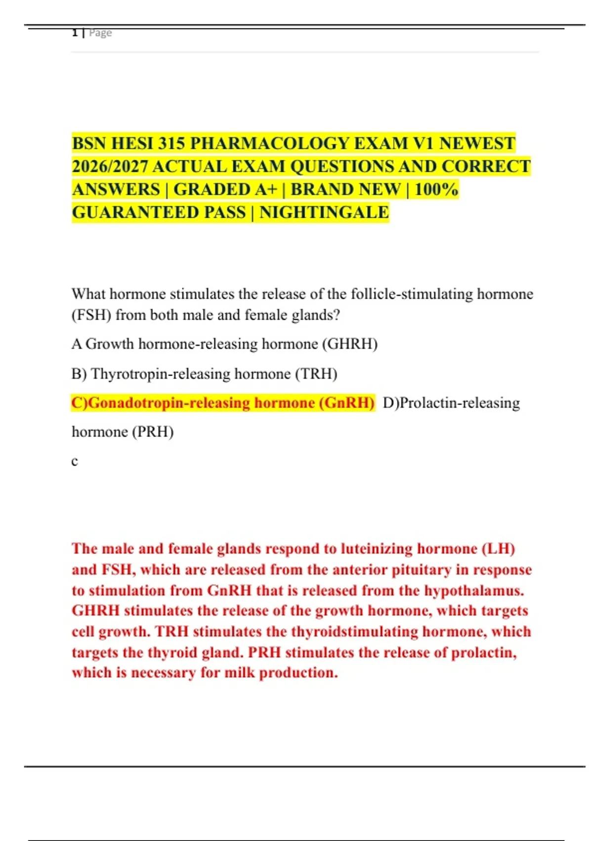 BSN HESI 315 PHARMACOLOGY EXAM V1 NEWEST
