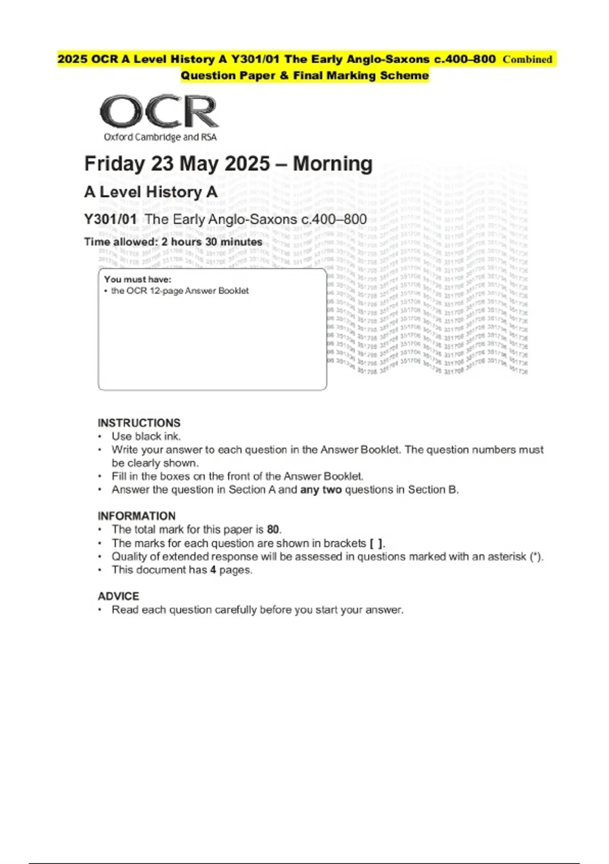 2025 OCR A Level History A Y301/01 The Early Anglo-Saxons c.400–800 Question Paper with Final Marking Scheme