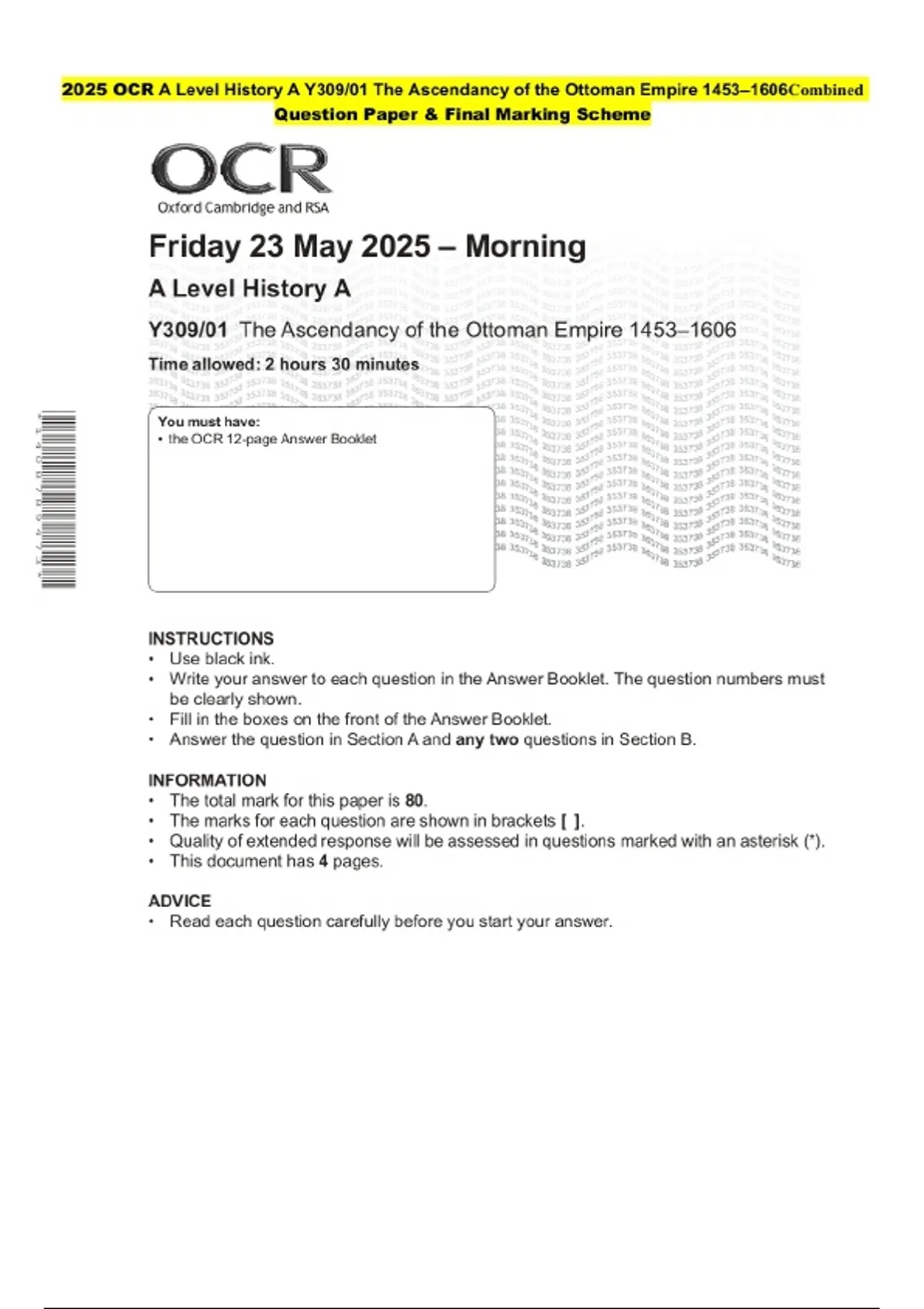 2025 OCR A Level History A Y309/01 The Ascendancy of the Ottoman Empire 1453–1606 Question Paper with Final Marking Scheme