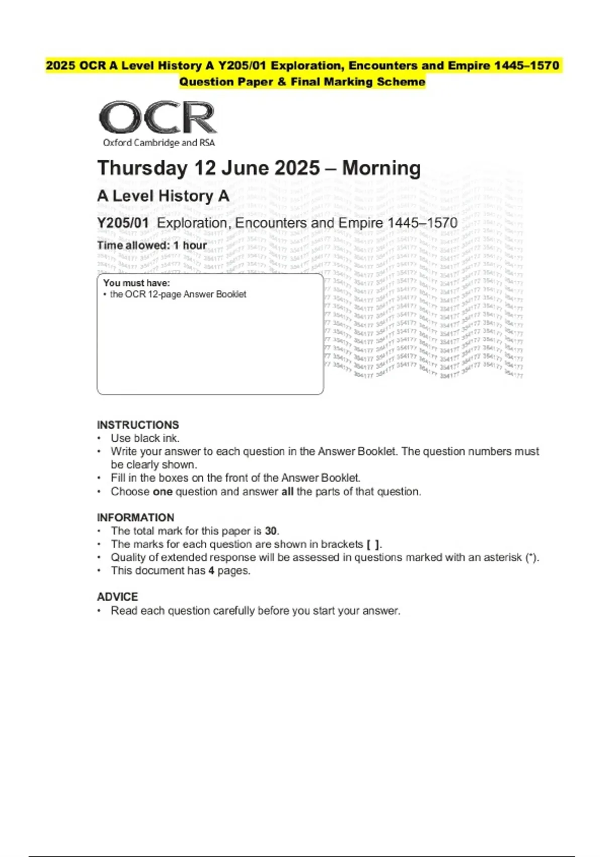 2025 OCR A Level History A Y205/01 Exploration, Encounters and Empire 1445–1570 Question Paper with Final Marking Scheme
